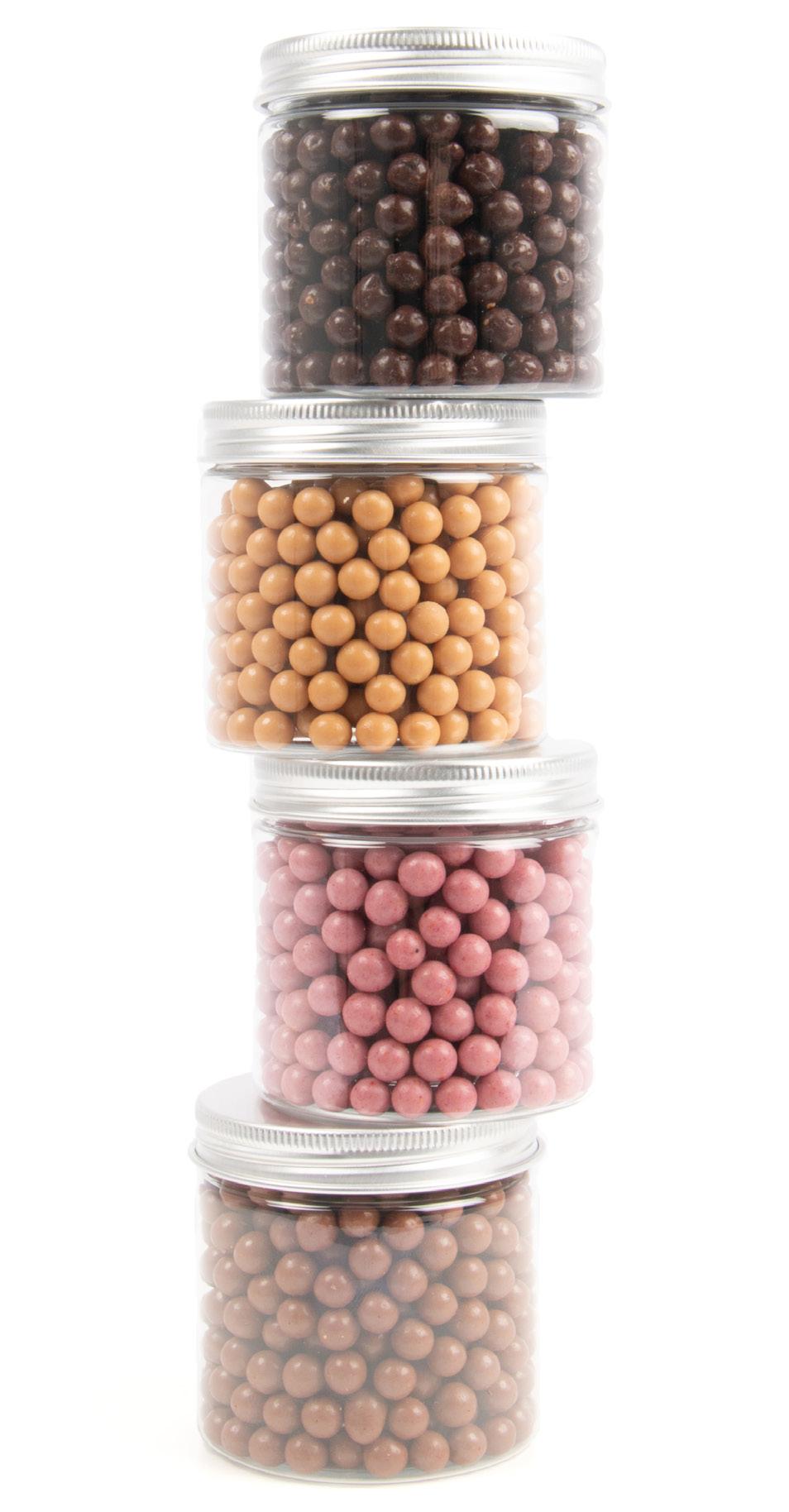 Les boules de nougatine sont de minuscules perles de chocolat brillantes d’une taille de 5 mm seulement. Une nougatine aux amandes a été utilisée dans le noyau, ce qui leur confère un croquant surprenant. Seul le meilleur chocolat est utilisé pour garantir un goût inégalé à ces perles.