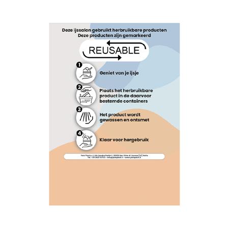 Pancarte met duidelijke uitleg omtrent het gebruik van herbruikbare ijslepels en verpakkingen.