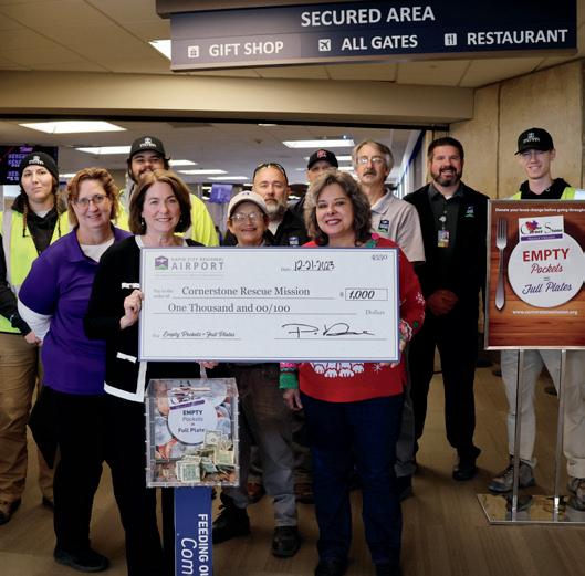 On December 21, 2023, Rapid City Regional Airport’s “Empty Pockets = Full Plates” program donated $1,000 to the Cornerstone Rescue Mission. The program encourages travelers to donate their loose change at the TSA checkpoint to support homeless individuals in Rapid City.