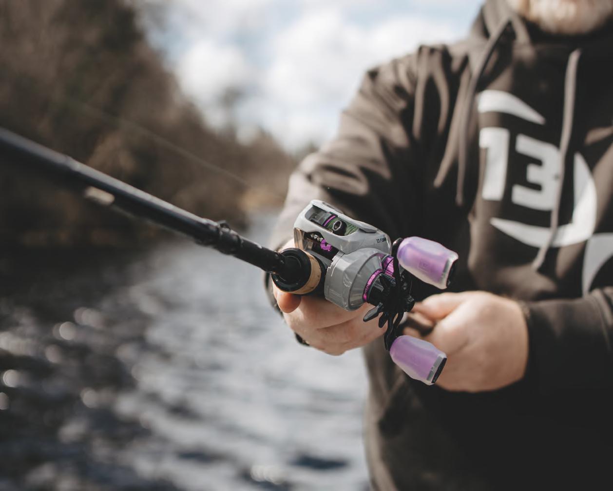 The new Bulldog Carbon Drag System packs 25 lbs. / 11 kg of stopping power. Equipped with H.A.M. brass main gear and cut with Japanese Hamai Precision, it’s a formidable weapon. The ultra-low palm fitting profile features 25% more line capacity while maintaining a manageable size. The Concept A Gen II proves design intelligence through features like its Railed Clutch Cam, Gen II Line Guide, and new water channeling frame. The new Low-Friction Braking System provides anglers with finer, more relevant adjustments for all lure weights. The reel is packed with unique and patented 13 Fishing only features like the Arrowhead Line Guide, Beetle Wing Rapid Access Side Plate, and KeepR Integrated Hook Keeper.