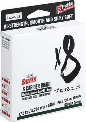 Sufix x8 is a round, easy to handle and silky-smooth Japanese-style braided line. It has an 8-carrier construction of thin HMPE fibers making it a super strong, thin line with high abrasion-resistance and superb knot and shock strength.The R8 Precision Braiding technology with a high-tension weaving process gives this line its distinct supple and smooth qualities that have consistent diameter and quality plus an excellent strength to diameter ratio.The materials and construction mean that the line has low friction when passing through the rod guides. This results in silent performance and long, accurate casts.Sufix x8 is designed for both casting and spinning reels. It is a great option for smaller lures, light soft plastics (jigging), perch, trout, rainbow trout and finesse fishing.