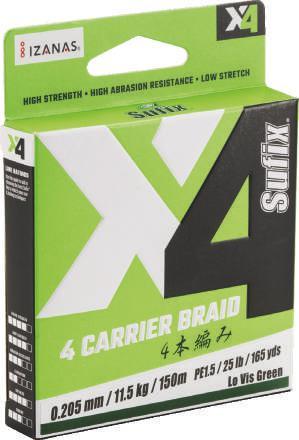 A four carrier premium braided fishing line made with 100% Japanese UHMPE fibers for high breaking strength and extreme abrasion resistance for fishing in demanding conditions and large baits. Super low stretch improves sensitivity and hooksets.