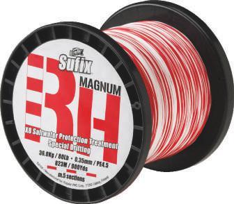 RH Magnum is a 8-carrier premium braided fishing line made with 100% Japanese UHMPE Izanas fibers for high breaking strength and extreme abrasion. Designed specifically for drifting and live bait trolling, the RH Magnum features color changes in the line every 5 meters. The alternating red and white pattern allows you to precisely monitor and control the length of line released, crucial for maintaining the optimal bait position.