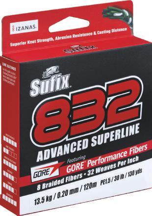 Sufix 832 Advanced Superline® is the strongest, most durable small diameter braid. It is built with 8 fibers (7 HMPE plus 1 GORE® Performance Fiber) and 32 weaves (pics) per inch. Due to its high-pitch count, it is also hydrophobic (water-repellent).The R8 Precision Braiding and fiber technology provide superior strength, roundness and line consistency. By adding GORE® Performance Fibers we improve abrasion resistance, increase casting length/accuracy and reduce line vibration. HMPE fibers provide the high strength and sensitivity, hydrophobic water-repellent protection and small diameter. All of this makes Sufix 832 Advanced Superline® 30x more abrasion-resistant than other braids.