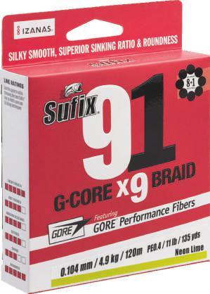 The Sufix 91 G-Core continues Sufix’s range of braid lines with ultra-reliable performance when casting and fighting the fish. With an abrasion-resistant GORE® Performance Fiber in the core and 8 precision-braided UHMPE fibers surrounding it, the 91 G-Core’s 9-carrier construction results in low stretch, better knot tying, and stronger holding power. The silky smooth 91 G-Core’s super-slick coating allows for long casting distance and superior sinking ratio.