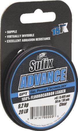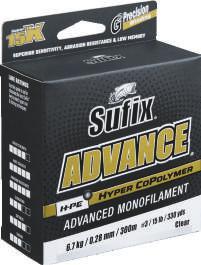 The most abrasion resistant, supple and sensitive monofilament. HMPE molecules blended in with the polyamides are drawn to the line’s surface in the Sufix’s proprietary Magnetic Extrusion Process, creating a durable layer that provides superior, long-lasting protection against abrasion. Unlike other abrasion resistant lines, Sufix Advance is very supple and sensitive, allowing subtle and precision presentations. With only half the stretch of a standard monofilament line, Sufix Advance offers exceptional lure control, ultimate bite detection and firm hook setting power. Thanks to the line’s inherent qualities and the Sufix G2 Precision Winding, Sufix Advance is virtually memory free, extremely easy handling and long casting. G2 Precision Winding in all spool sizes.