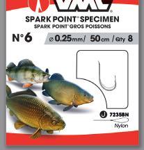 These coloured hooks receive a thin layer of unique varnish that covers the hook without affecting the sharpness of its point. The varnish creates a shield on Hi-Carbon and Vanadium® steel by covering the entire hook surface.When fishing in freshwater, these VMC® coatings will preserve hook sharpness, strength and appearance to the highest possible level.