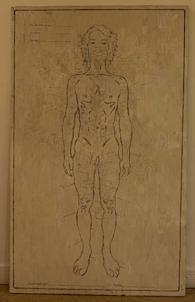 Fig. 8. Del proyecto Cruentación. Retablo de MDF intervenido con la técnica de Esgrafiado. Aquí me apropio de los diagramas forenses para retratarme y realizar una especie de “archivo-tumba”.