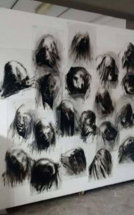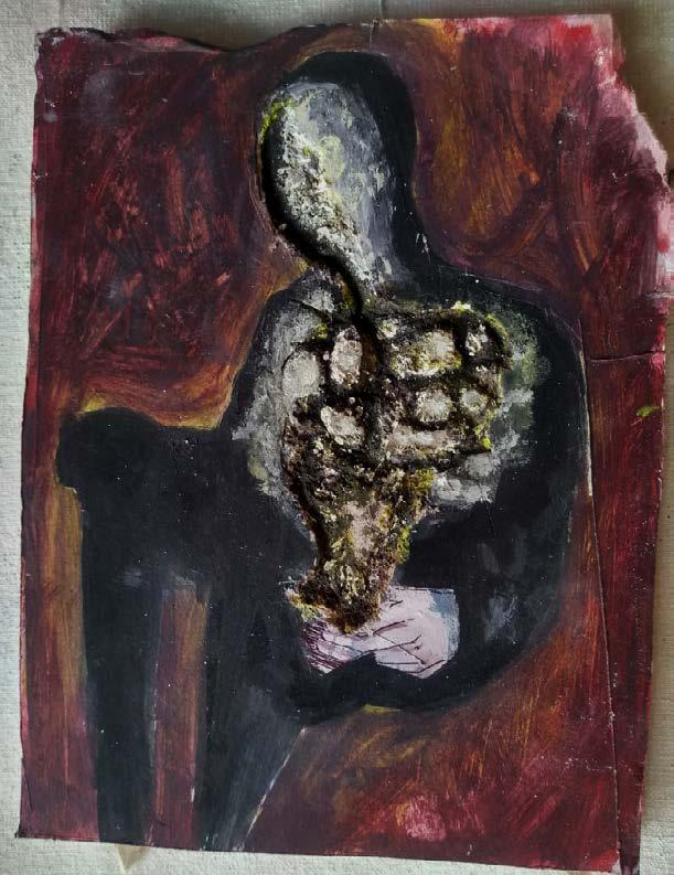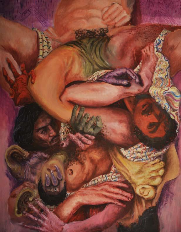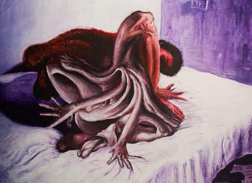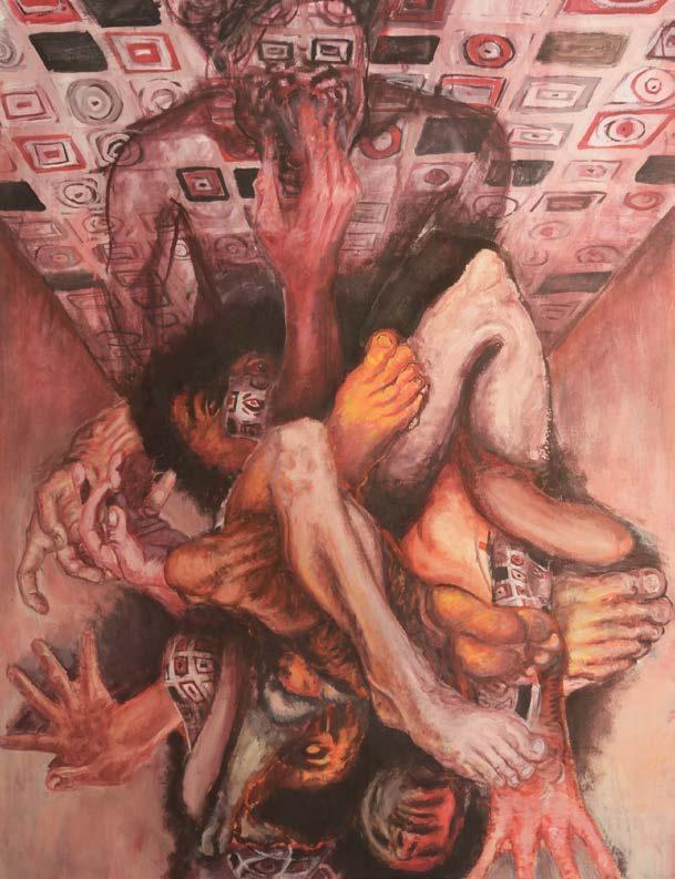 durante la infancia y adolescencia; tal vez por eso mi mirada tiene una mácula mórbida en la que se asienta un temor constante de datos que brutalmente se atiborran, siendo la consecuencia una inestabilidad de mi ser en el mundo. Me preocupa, y también me angustia, tener que lidiar con una sombra que se puede tornar más densa; una sombra que, desde la perspectiva arquetípica y simbólica -sin embargo, no menos real- de Jung, es lo que no se desea ser, pero que se vuelve esencial en la observación estética de lo íntimo. En consecuencia, he desarrollado un interés por la estética de lo horroroso y de lo grotesco, entendiendo éstos fenómenos de lo informe como un gran soporte para la búsqueda de sentido en lo ambiguo, lo inefable. En cierta medida, esto ha contribuido a concebir la práctica de la pintura como un espacio dentro del cual aprisiono “demonios” y en el que expongo los residuos de una lucha contra un vacío de traumas aglomerados, un horror vacui en el que cuerpos atiborrados se pierden entre sus extremidades, obsolescencia orgánica, una piel que grita tras erizarse por un escarbar doloroso y constante dentro del cuerpo. Por otra parte, toda aquella estética tiene algo oculto, algo esperanzador y salvador, una catábasis. El reconocimiento de la sombra, de lo más visceral, es el bello encuentro con lo extraño y lo raro, la fascinación ante lo mórbido, pero también el aprendizaje originado en los traumas. Mi obra contiene ciertas nociones médicas y psicológicas a la hora de ser construida, y que vínculo con mi interés por la filosofía existencialista. Primero, por ejemplo, relaciono la introspección filosófica como una observación de la enucleación de mis traumas y desde la ilusión de la mirada, y luego, abriendo mi cuerpo como en una autopsia, busco la causa de una muerte ontológica; pues así parece que la naturaleza ambigua de mis síntomas solamente puede ser vista desde una analogía con la ciencia y la artificiosidad del arte, la ficción. Debe existir de alguna manera, un juego libre con lo verdadero y lo ficcional que me permita crear narraciones y establecer reflexiones existenciales; un estudio de lo informe filosófico y psicológico desde una materialidad de la carne en el que el “yo es ante todo un yo corporal”, como lo menciona Freud; de ahí la visceralidad del alma.