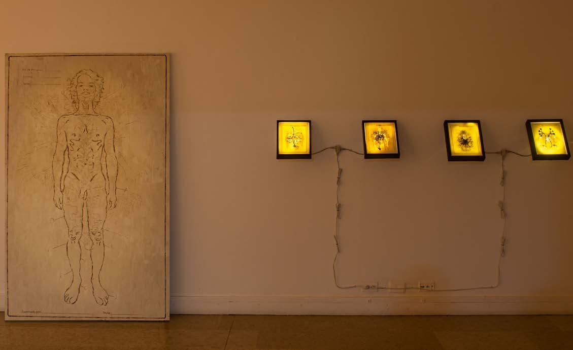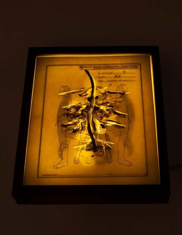 Fig. 9. Del proyecto Cruentación. Cajas de luz con estratos de papel con dibujos y pintura acrílica. Los dibujos eran intervenciones en