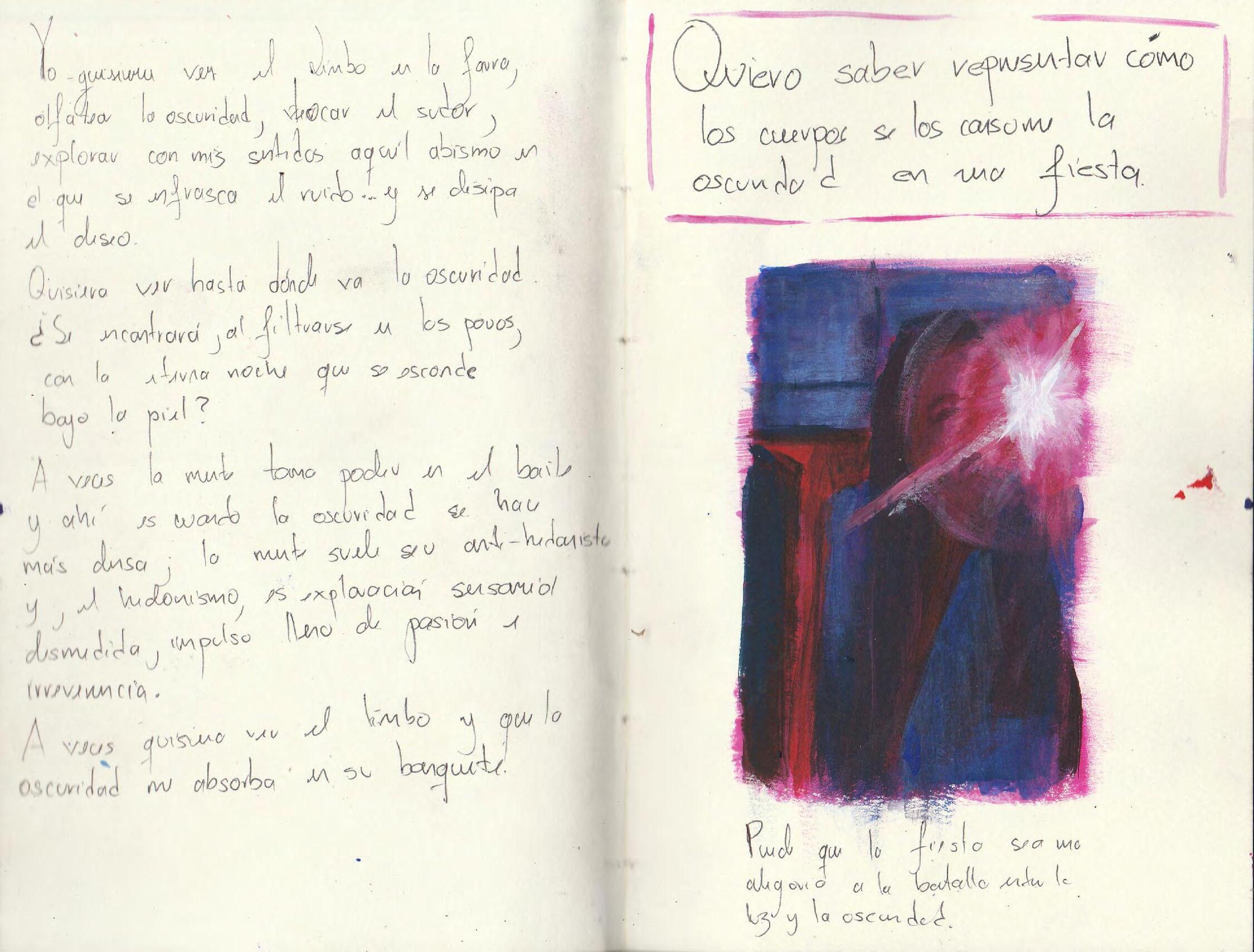 Explorar la fiesta para mí ha sido descender al infierno con la posibilidad de conocer mi más profundos temores, pero también de vivir y conocer experiencas cargadas de gozo en el que los deseos irrumpen mi corporalidad y me desafían a mezclarme con el ambiente.