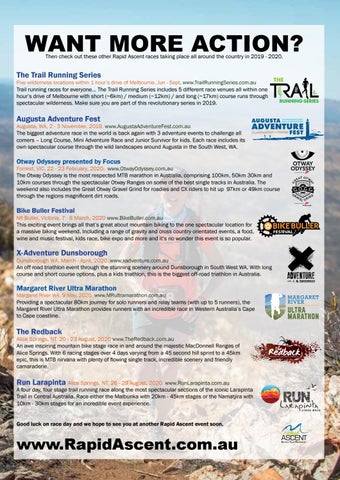 Five wilderness locations within 1 hour’s drive of Melbourne, Jun - Sept. www.TrailRunningSeries.com.au Trail running races for everyone... The Trail Running Series includes 5 different race venues all within one hour’s drive of Melbourne with short (~6km) / medium (~12km) / and long (~17km) course runs through spectacular wilderness. Make sure you are part of this revolutionary series in 2019.