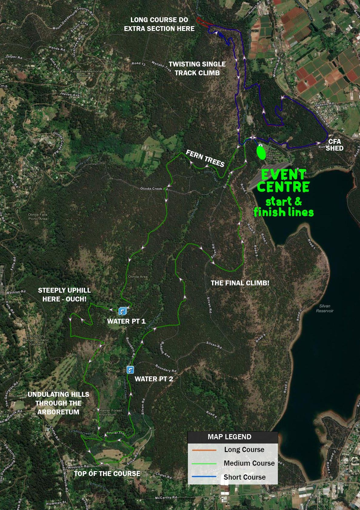 The Silvan courses are probably the hardest in the series primarily because of the HILLS! The medium and long courses especailly include big climbs, often on slippery, wet trails some that take some extra energy and determination to conquer. Having said that, all courses pass through some magnificent landscapes and make for some rewarding (if not a little challenging) running. Be prepared and you will love it!