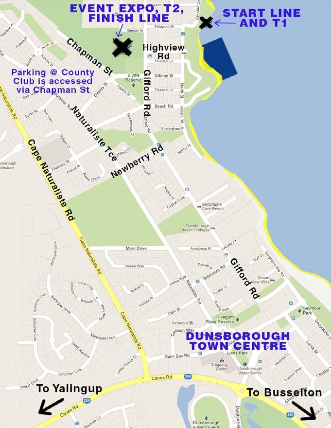 • Swim start and (T1 swim > MTB):. Adult races will start in the water at the Old Dunsborough Boat ramp at the end of Finlayson St. T1 will also be in the car park at the Old Dunsborough Boat Ramp,