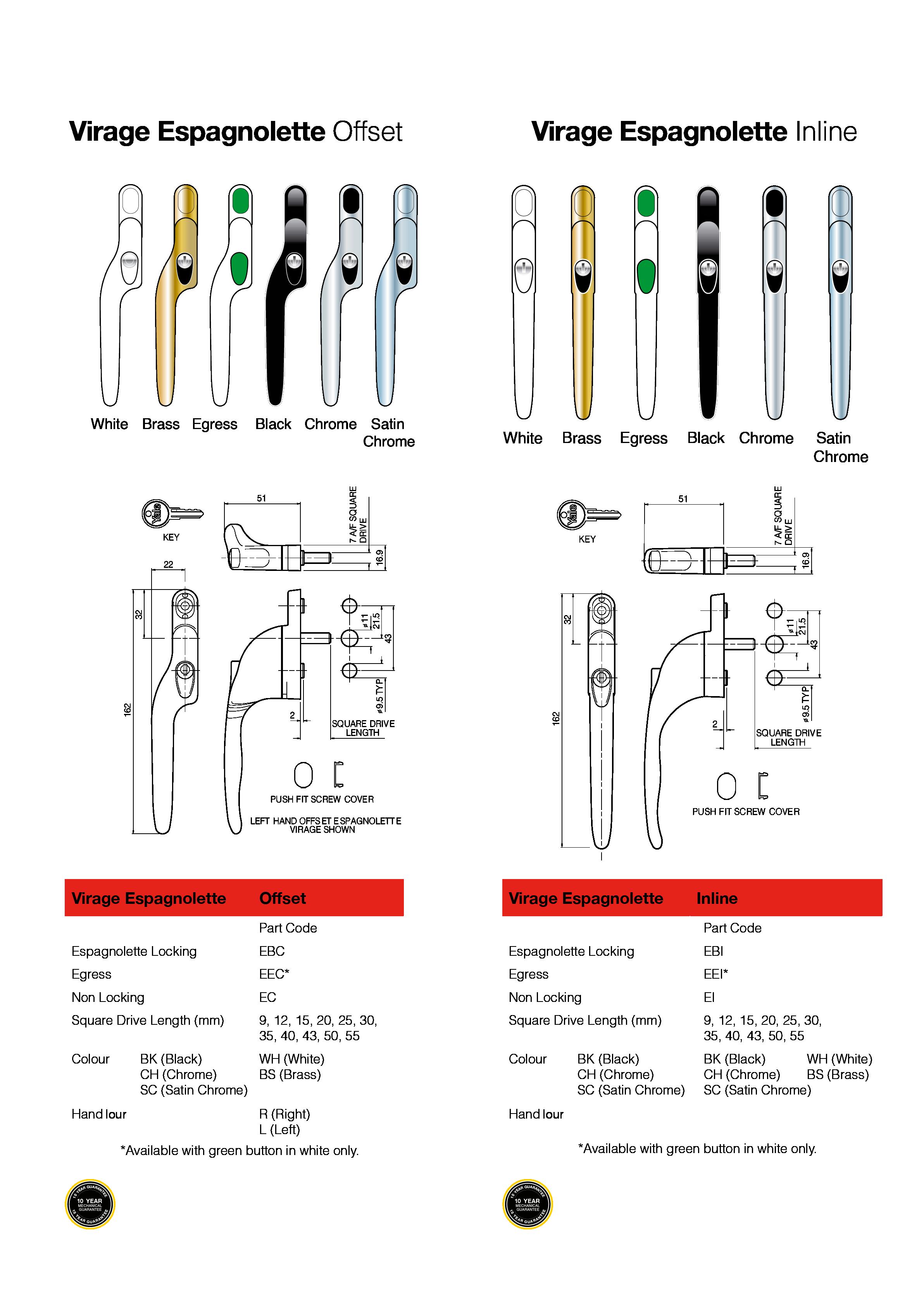Available in offset and in-line Espagnolette and Cockspur, the Virage handle range offers: