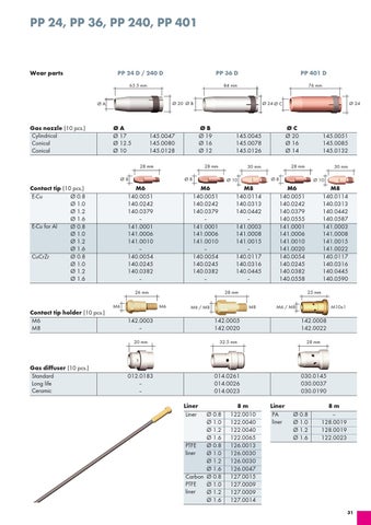 Contact tip (10 pcs.) Ø 0.8 E-Cu Ø 1.0 Ø 1.2 Ø 1.6 E-Cu for Al Ø 0.8 Ø 1.0 Ø 1.2 Ø 1.6 Ø 0.8 CuCrZr Ø 1.0 Ø 1.2 Ø 1.6