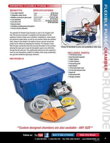 The patented CK Flexible Purge Chamber is used in the Tungsten Inert Gas (TIG) process to provide a completely inert atmosphere for the welding of reactive metals such as titanium, molybdenum, nickel-based and aluminum-based alloys, as well as non-reactive metals like stainless steel. Unique to this design is the ability to draw a vacuum around the product to be welded by collapsing the chamber. The chamber is then filled through a perforated hose that encircles the bottom of the chamber allowing the argon gas to expel all atmospheric gases more effectively through the top valve port. This significantly reduces the time required to reach an inert atmosphere suitable for welding, while using considerably less gas than traditional rigid purge chambers.