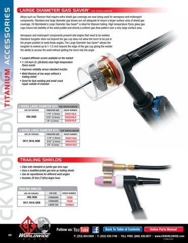 TRAILING SHIELDS • Clips onto standard or jumbo gas lens cups • Uses a modified jumbo gas lens as trailing shield • Can be repositioned for different weld angles • Includes 25 foot (7.62m) Argon hose