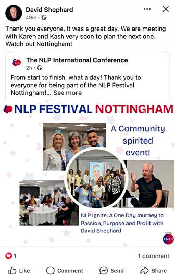 The NLP Festival in Nottingham was a very special event. There are posts and comments on LinkedIn and other social media platforms from some of the attendees who gained personal insights for their business and came away with truly actionable plans. Three weeks on from the festival (at the time of writing) and those plans are already being executed and the benefits are being reaped.