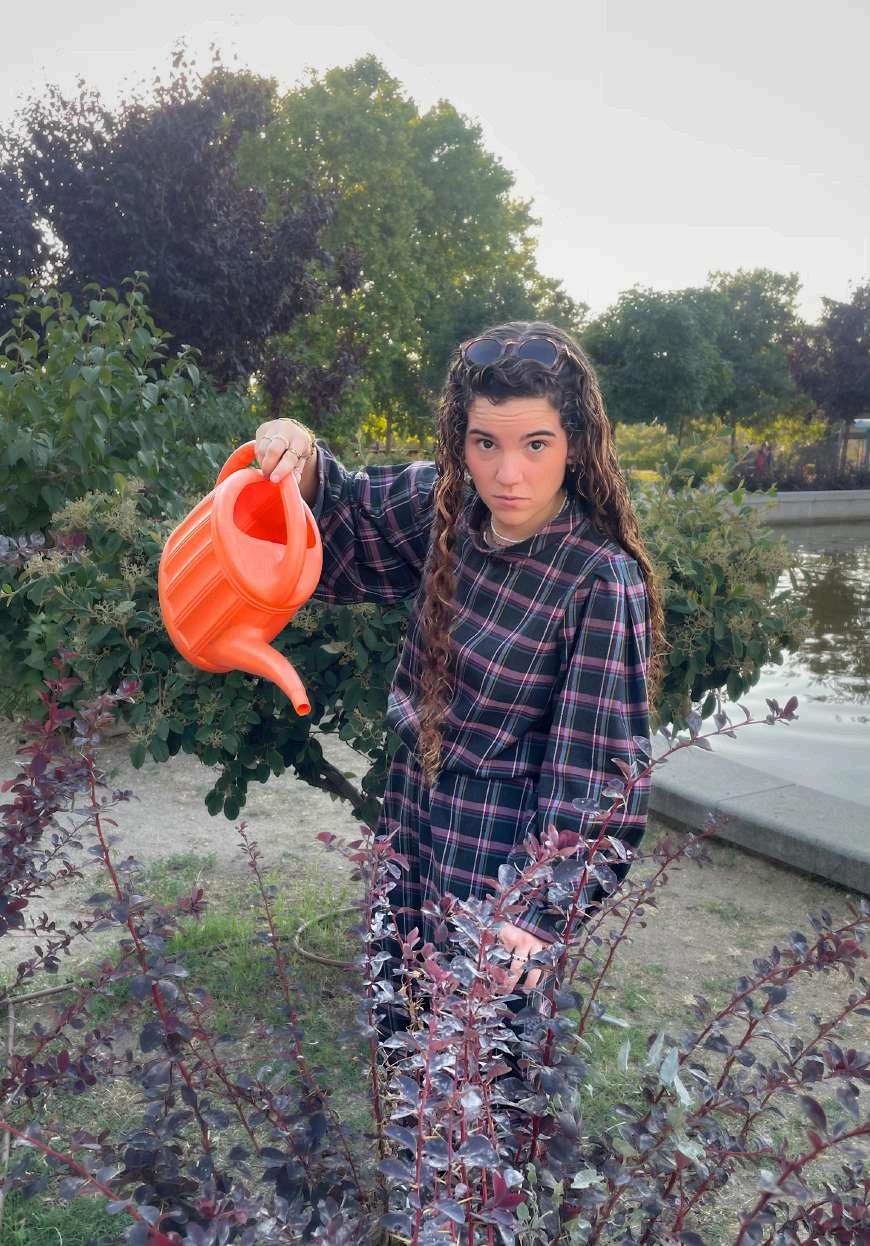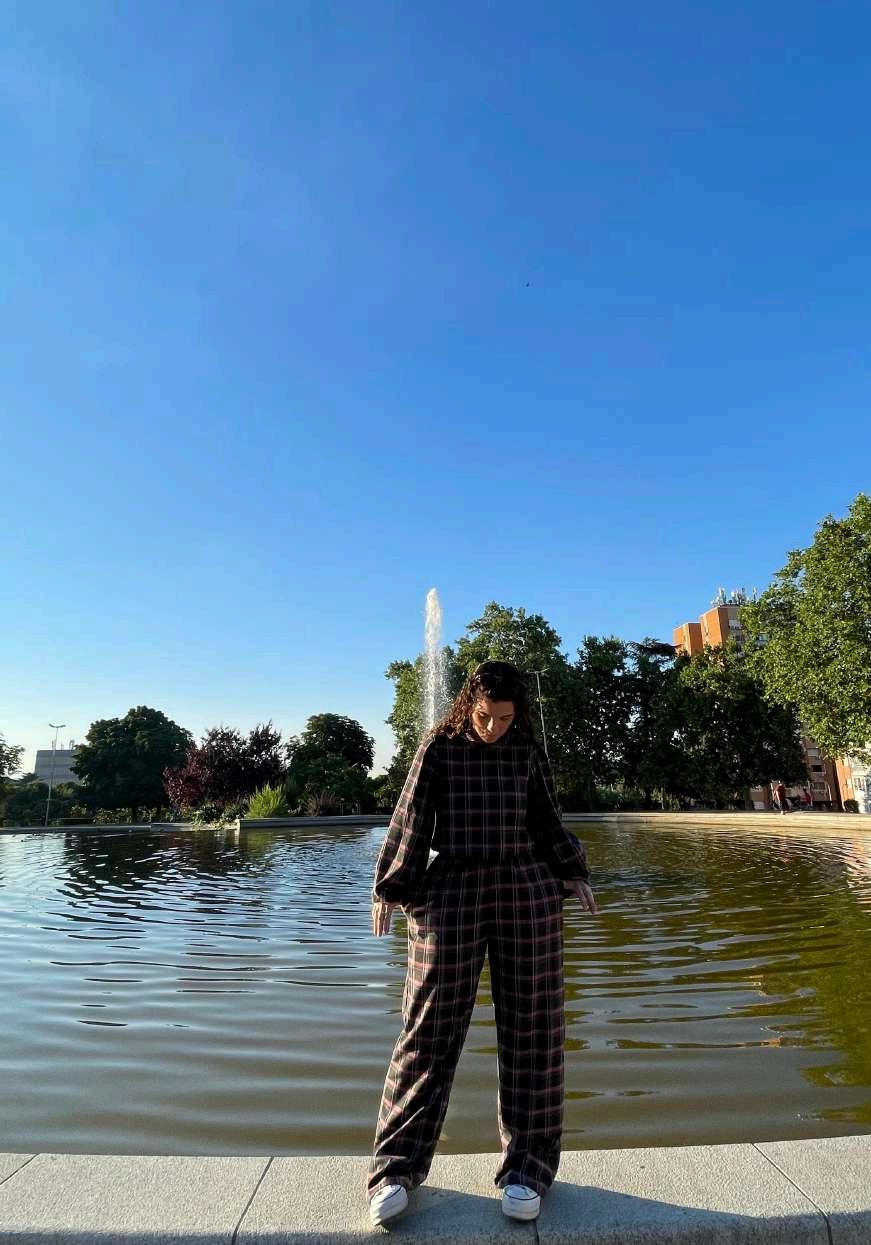 He escogido este tejido característico de la moda contemporánea, para transmitir elegancia y hacer alusión a mi infancia, ya que en los dos colegios a los que he ido teníamos que usar uniforme, que constaba de faldas que me recordaban al kilt de los escoceses.