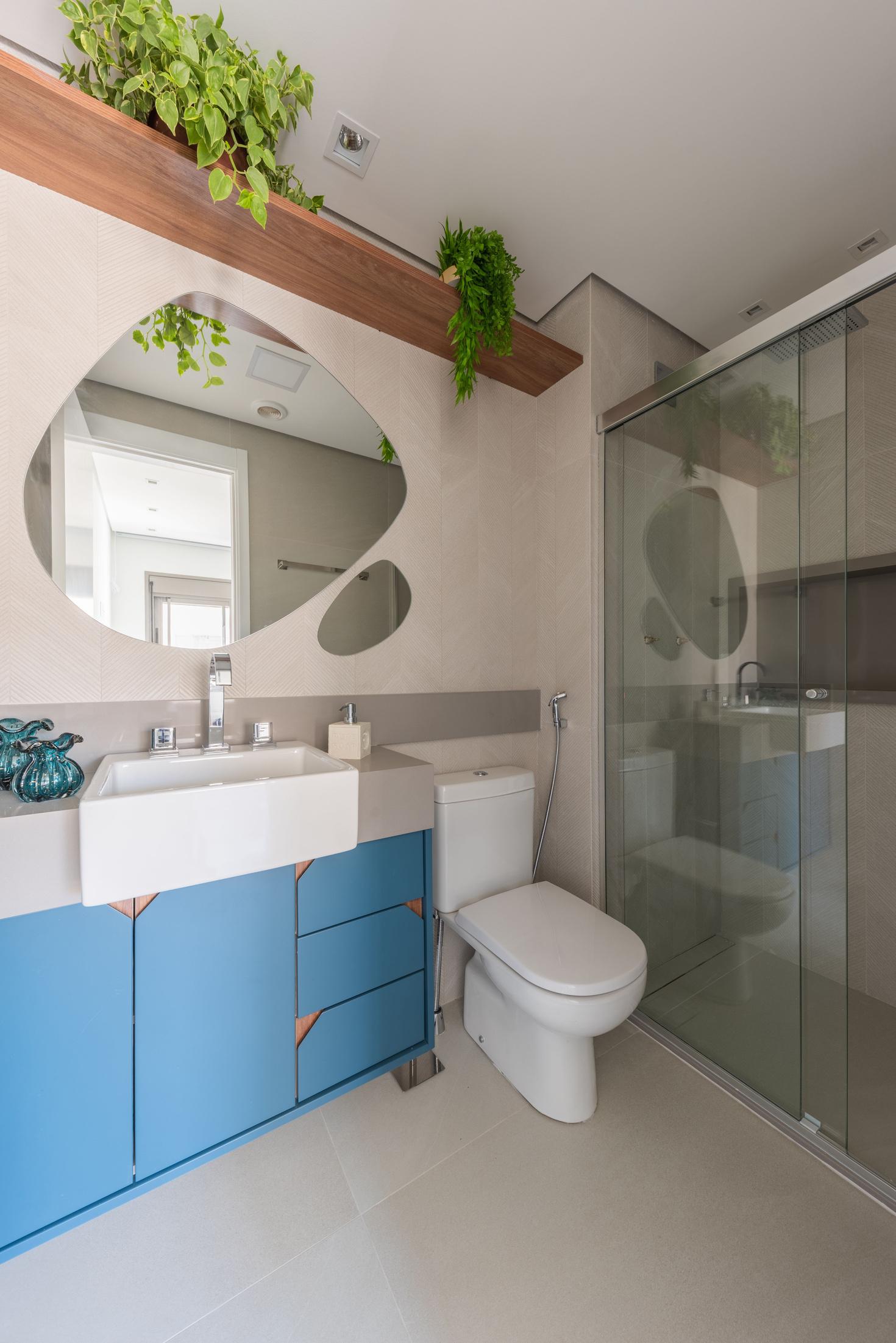No banheiro do quarto de hóspedes, o arquiteto Bruno Moraes se inspirou na ousadia: sua ideia era tornar o ambiente divertido e com temática jovem. Portanto, ele optou por escolher uma marcenaria na cor azul, que contribuiu para adicionar vida e alegria ao cômodo. Na área do box, revestida com porcelanato, nicho para shampoo e sabonete iluminado por led. Nesse quesito, o arquiteto alerta: “Ao escolher o led, procure por uma versão que tenha proteção contra a água ”