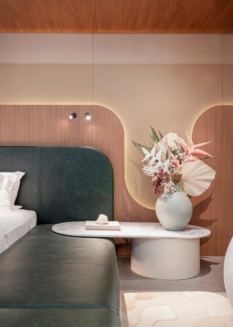 A suíte é segmentada entre área do banheiro, closet e espaço de descanso A área de descanso conta com uma mega cama com design assinada por Nelson, em parceria com a Reveev, desenhada a partir de curvas e formas orgânicas, com uma cabeceira e estofados feitos em couro natural na cor verde que abraçam o colchão, além de duas mesas de cabeceiras assimétricas numa combinação de mármore e marcenaria em laca A cama conta com entradas USB e pontos de carregamento por indução nas laterais do estofado, assim como iluminação LED no entorno da mesma, que causa um efeito de soltura flutuante do chão.