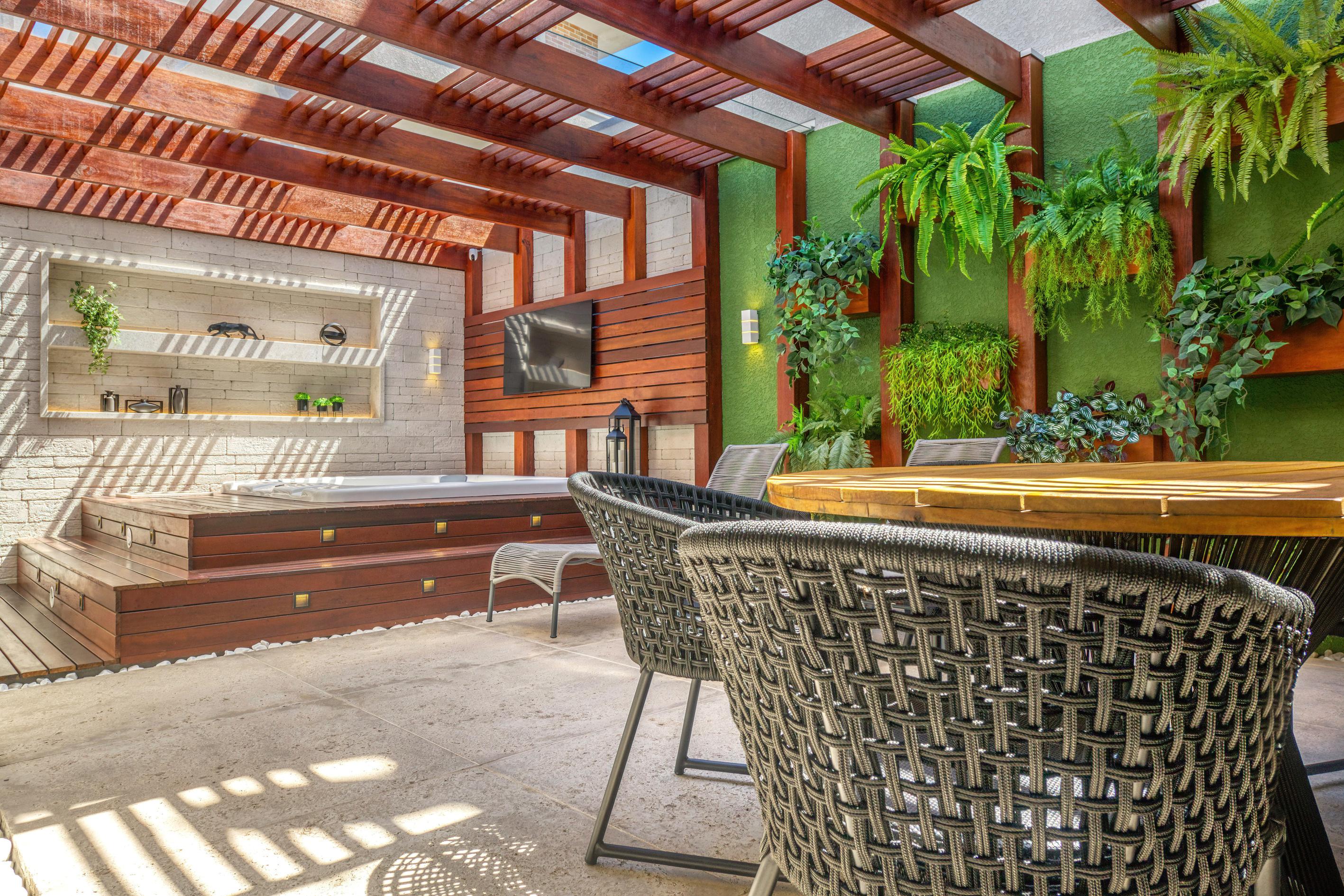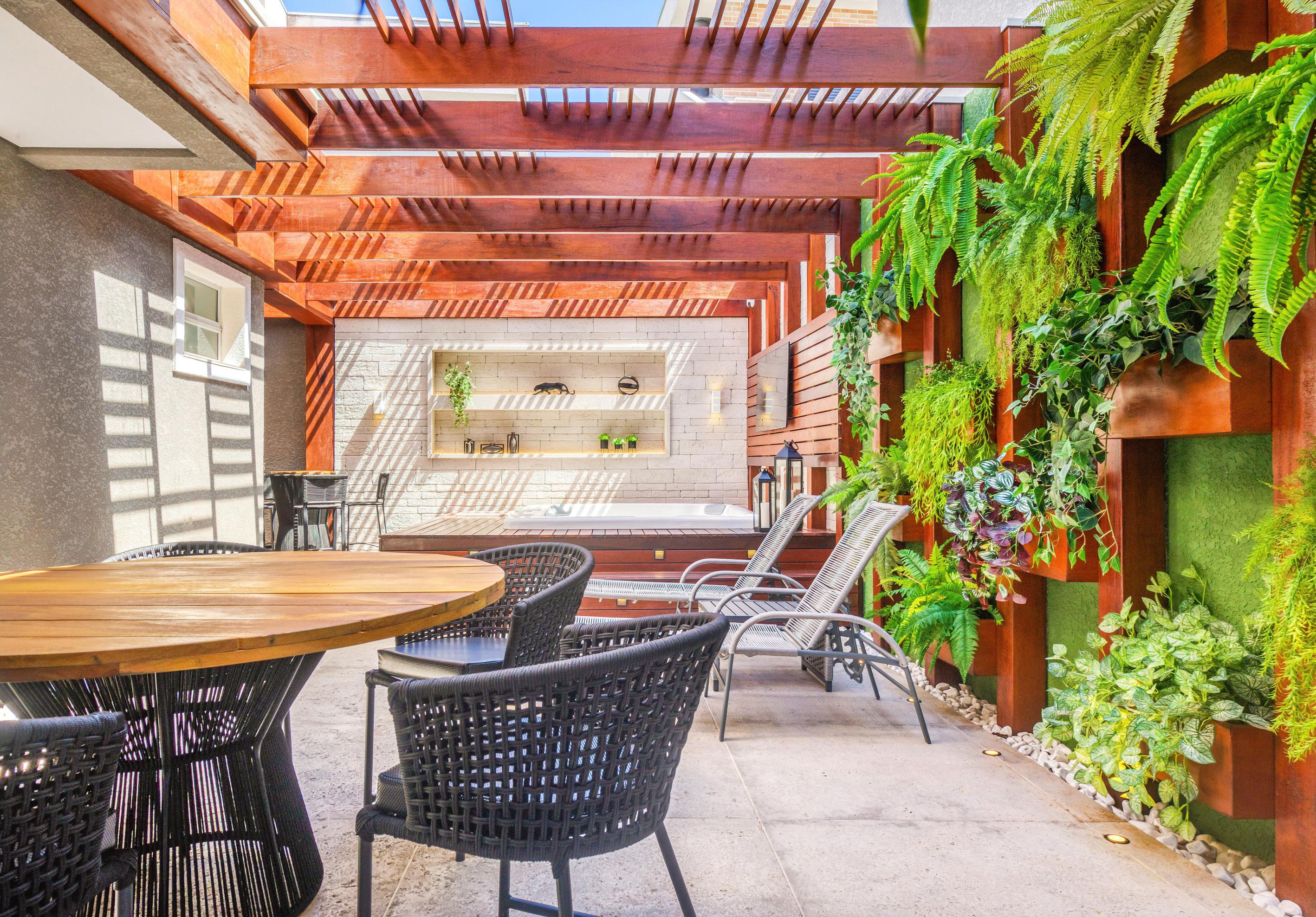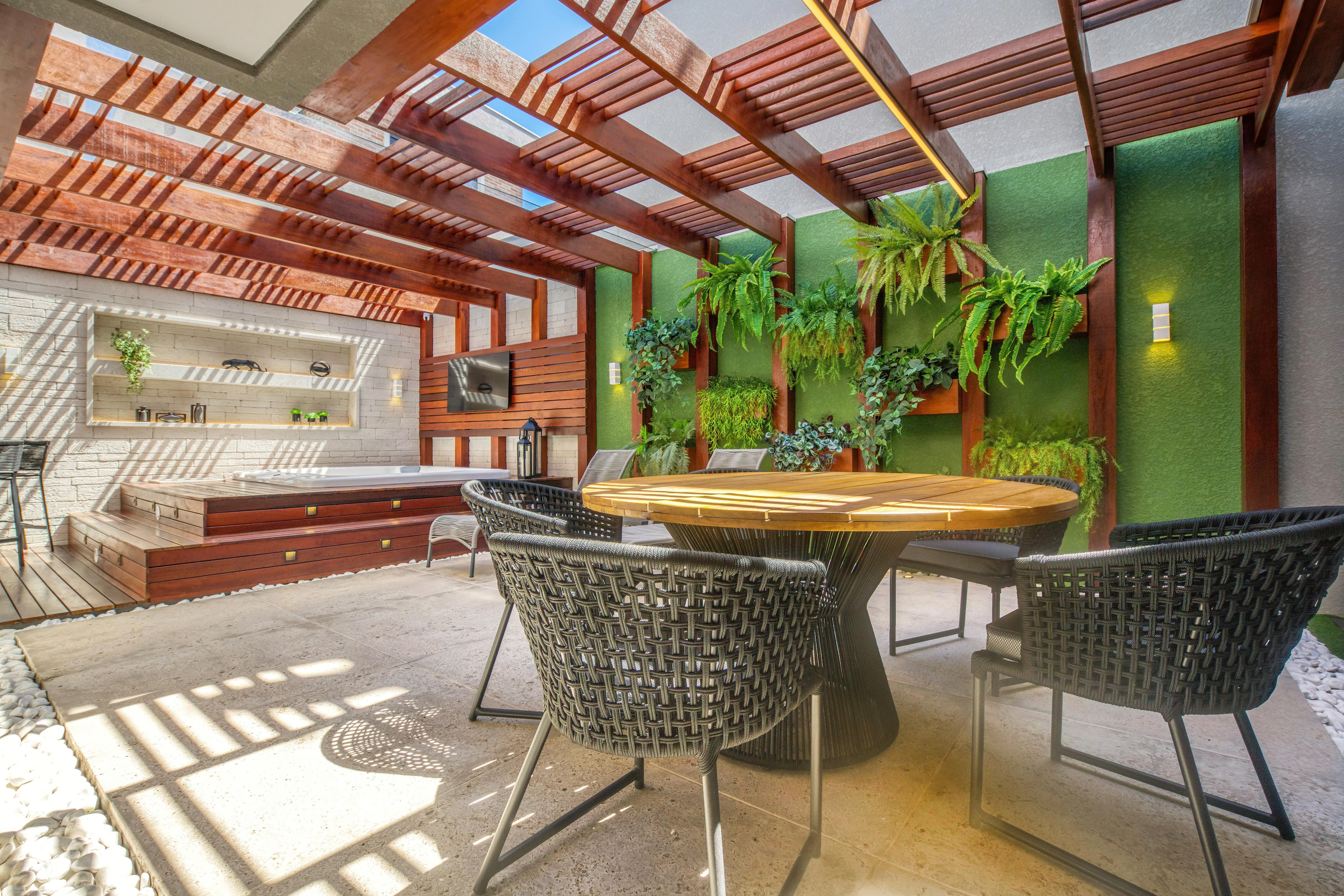 Sob um pergolado bem elaborado, as travessas proporcionam um interessante desenho de sombreamento sobre o espaço. A mesa com tampo de madeira e as cadeiras de cordas náuticas encaixaram perfeitamente na área ensolarada. A parede verde confere ao ambiente uma estética harmoniosa. Na estrutura do pergolado instalaram se os cachepôs com vegetação. Além de ocupar pouco espaço, tornou se uma ótima alternativa para quebrar a monotonia do cinza urbano, trazendo a sensação de bem estar através da conexão com a natureza. Logo mais ao fundo o deck recebe um SPA para os momentos de “relax”.