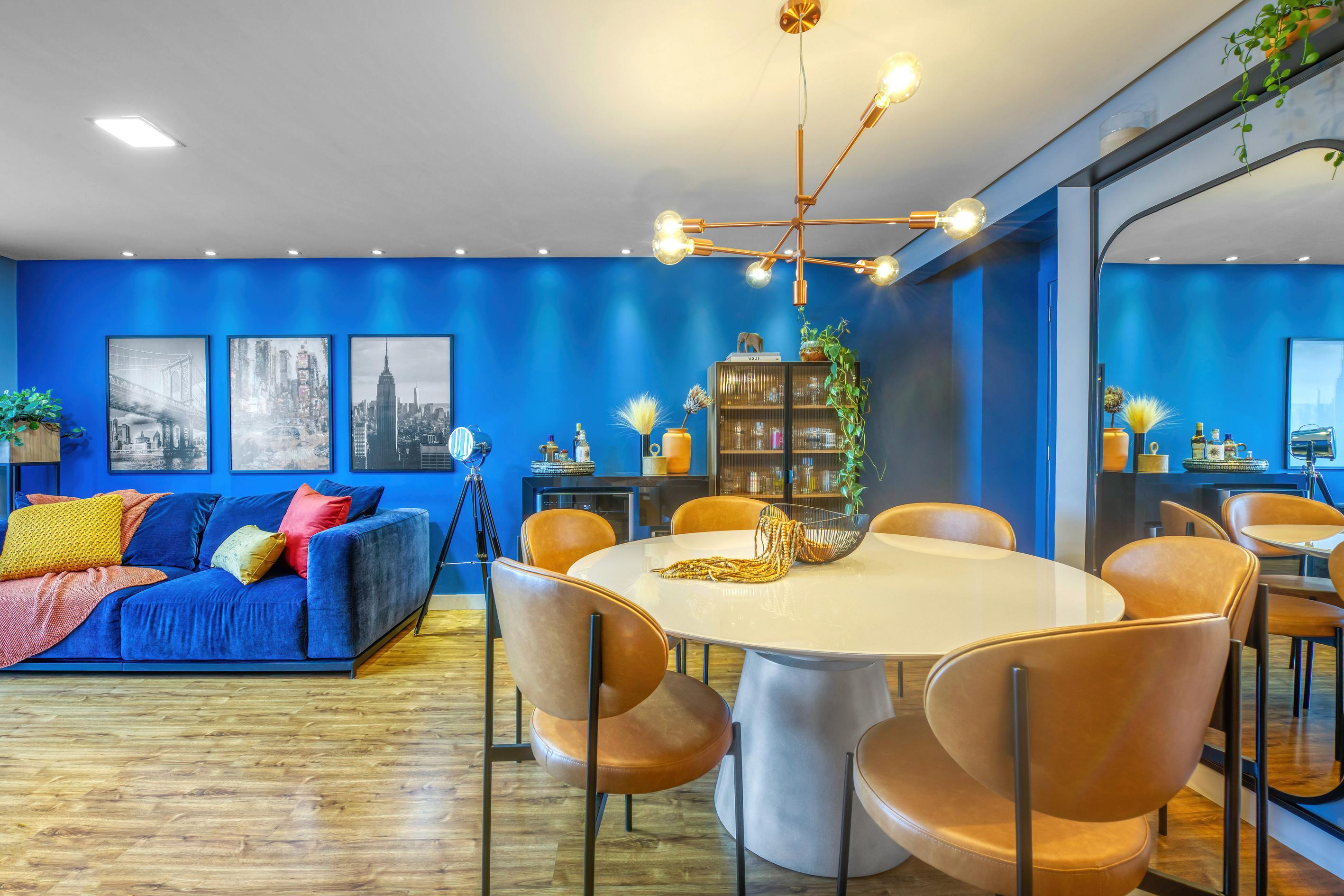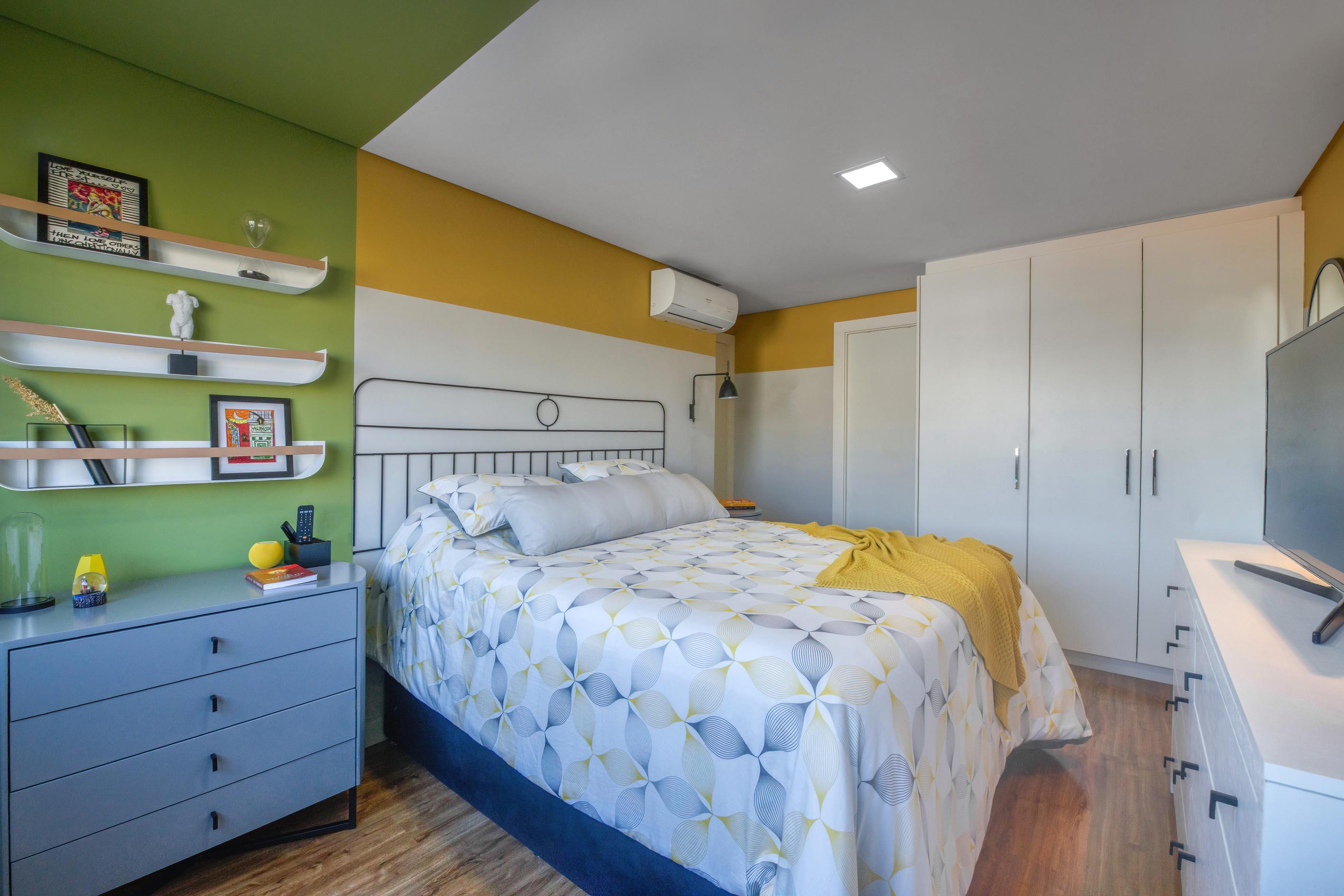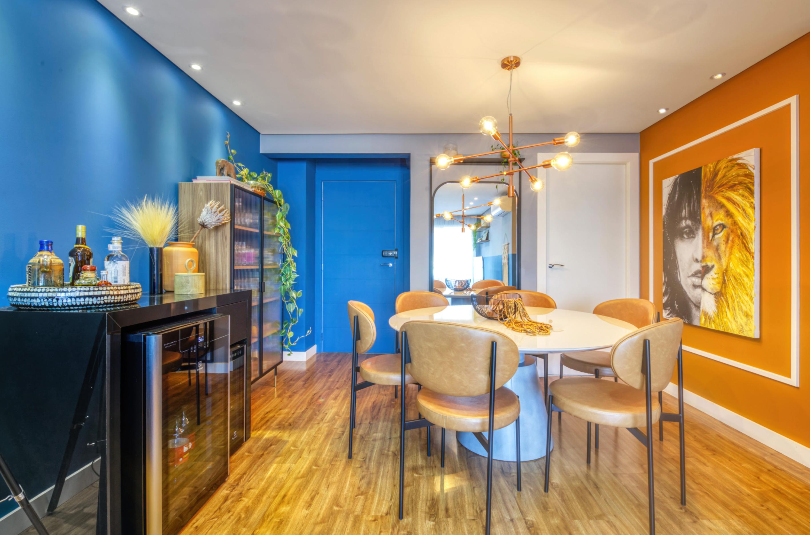 Um apartamento com a personalidade de um jovem casal, moderno, autênticos e viajantes. Neste projeto os clientes solicitaram algo diferenciado, com uso de cores e que exprime a identidade deles. O desafio era não fazer grandes intervenções no imóvel, uma vez que as chances de uma mudança de cidade em breve seria bem provável. Para atender este escopo, propusemos abusar do mobiliário solto e ousar das pinturas nas paredes