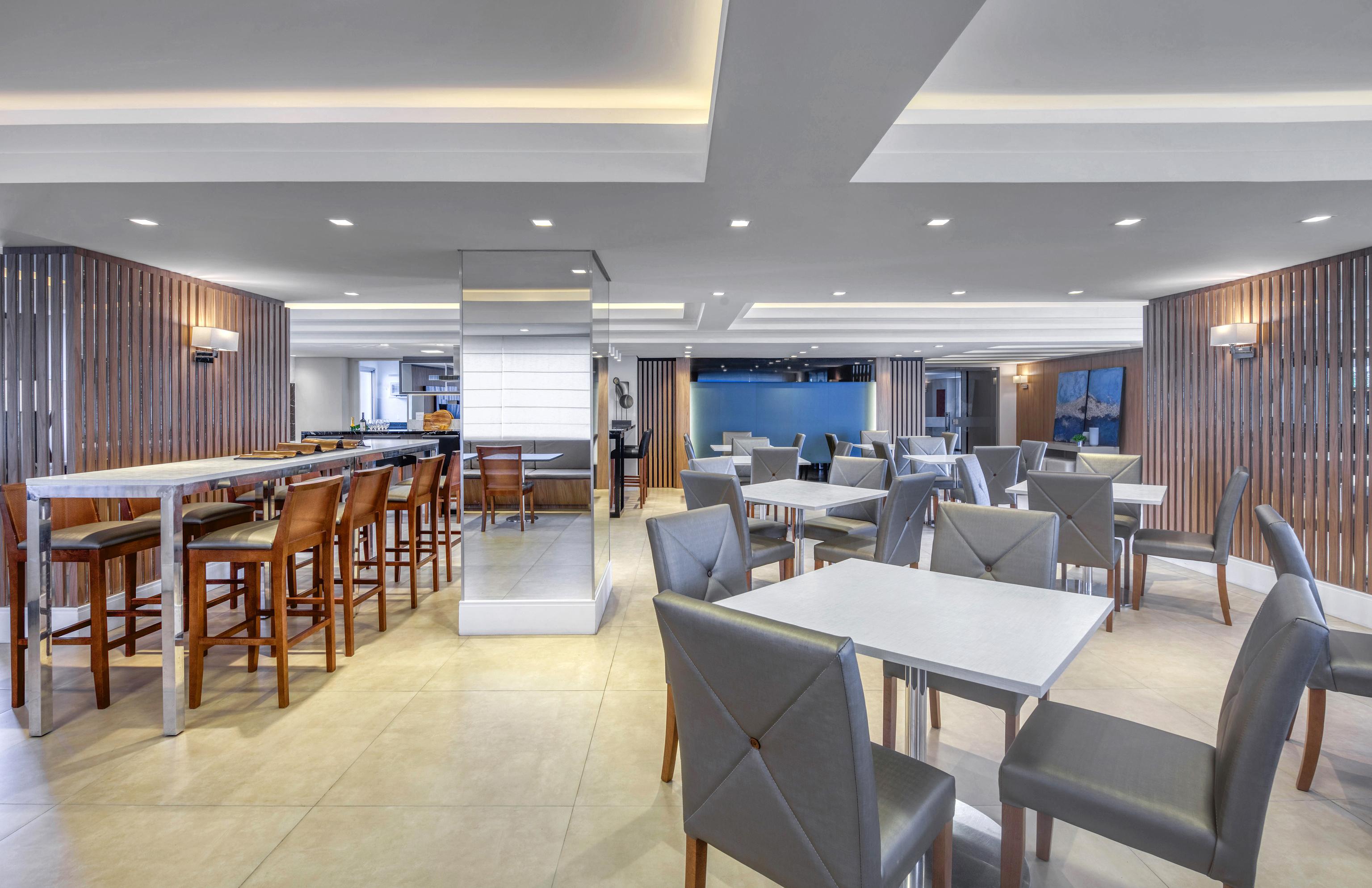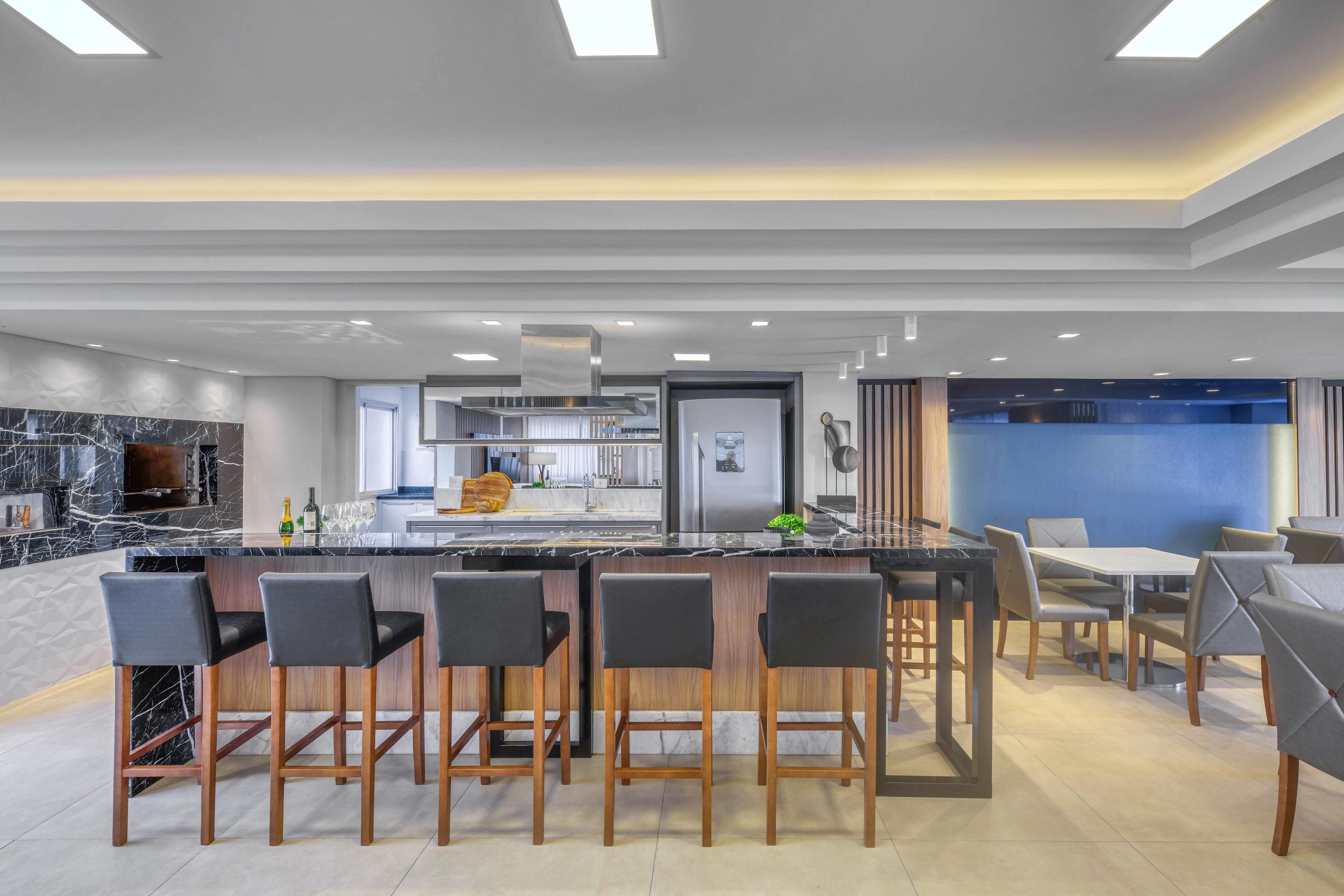 Como o salão tinha alguns pilares, subdividindo o espaço, tiramos partido desta situação para criar ambientes, tais como: 1- lounge com tv, sofá e poltronas confortáveis. 2- mesa bistrô com banquetas altas. 3 mesas soltas que permitem alterar o layout juntando-as umas as outras. 4- espaço kids com entretenimento de tv e jogos para as crianças. 5 - e por fim, mas não menos importante, a criação da área gourmet com churrasqueira e forno de pizza (anteriormente o condomínio não tinha nem a churrasqueira nem o forno de pizza) com cooktop e cervejeira, e também a cozinha funcional, com equipamentos e eletros adequados foi primordial.