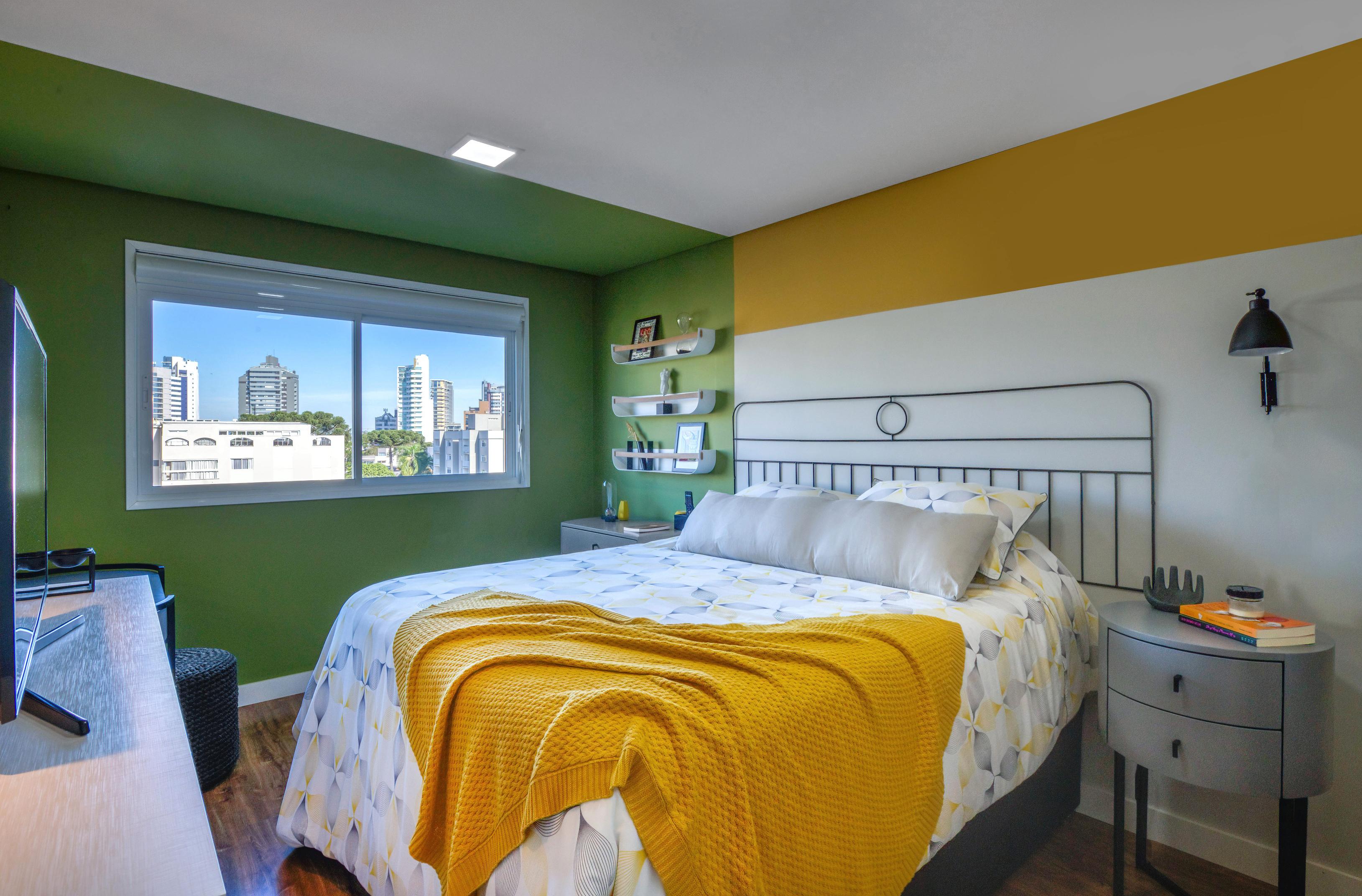 No quarto o escritório desenhou a mesa de cabeceira e também a penteadeira utilizando estrutura metálica e laca cinza. As cores nas paredes e dispostas de forma geométrica, trouxe um ar mais descontraído para o ambiente.