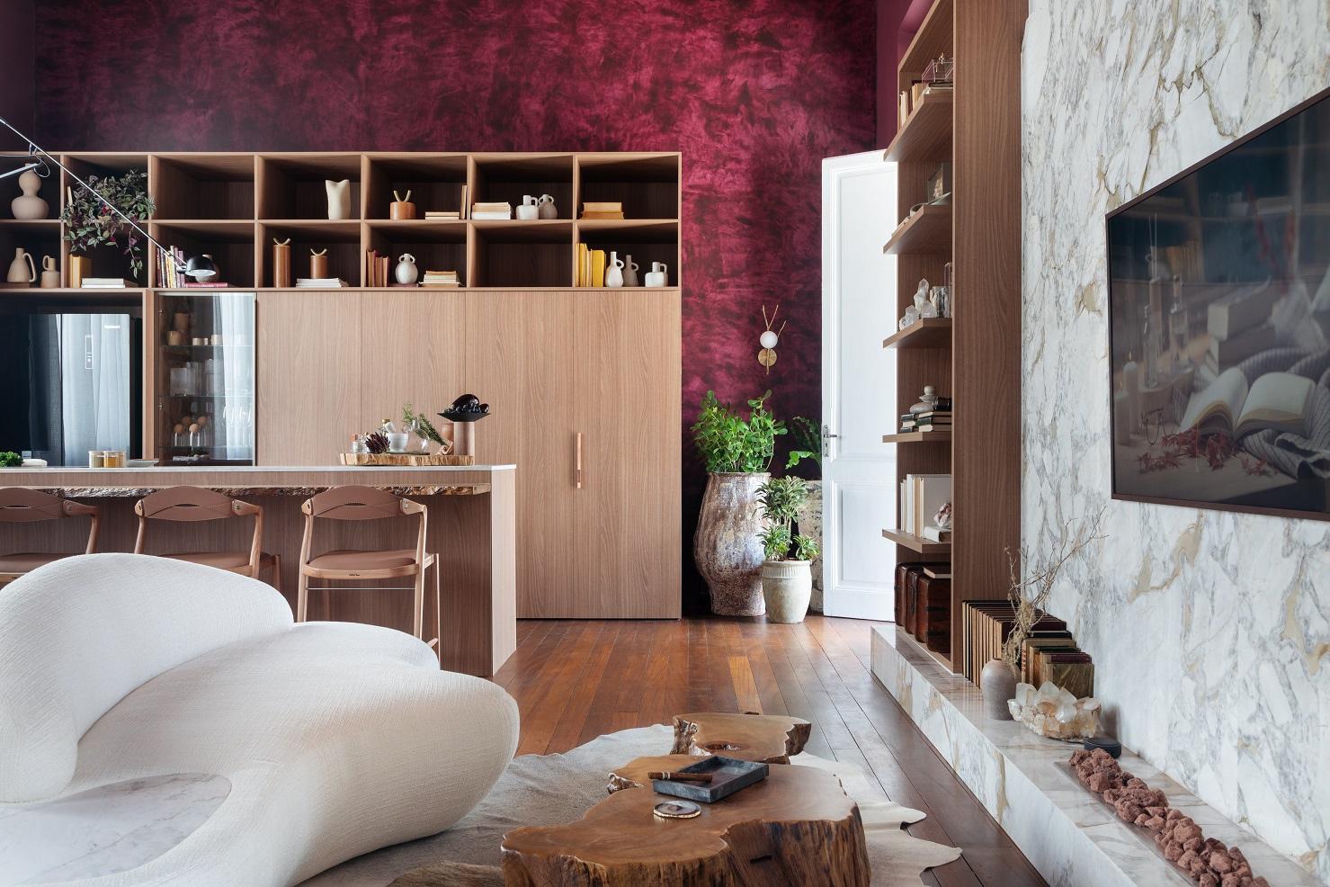 Para sua quarta participação na CASACOR SC, a arquiteta de Balneário Camboriú, Natália Xavier apostou na cor vinho de mesa com textura envelhecida e tons amadeirados para aquecer e compor seu ambiente, um loft com 58 m²