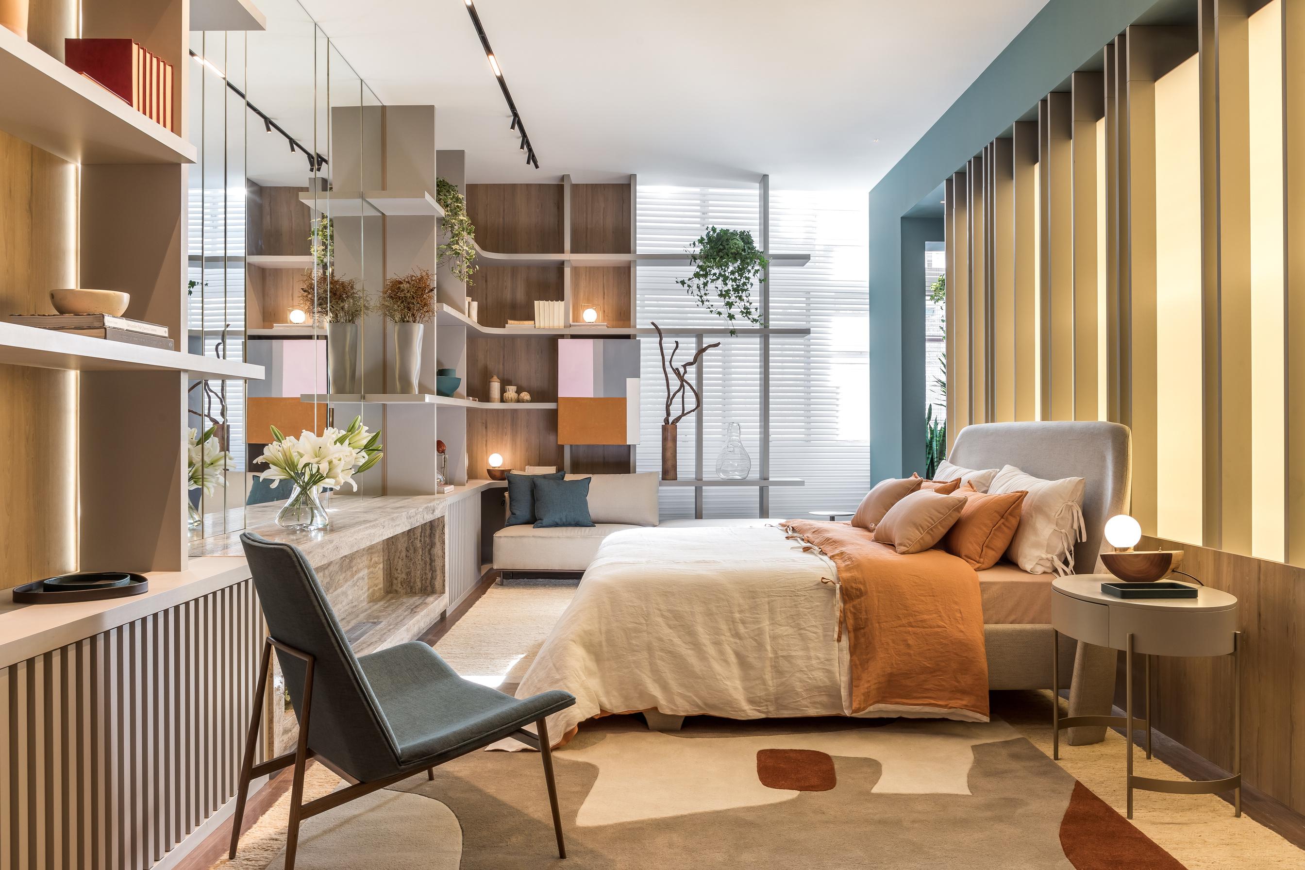 Contextualizando com sua personalidade, o Designer investe em pedra natural, madeira e alfaiataria, com todo o aconchego que um quarto requer, remetendo a essa questão afetiva e transformando o local num espaço que te acolhe, te abraça