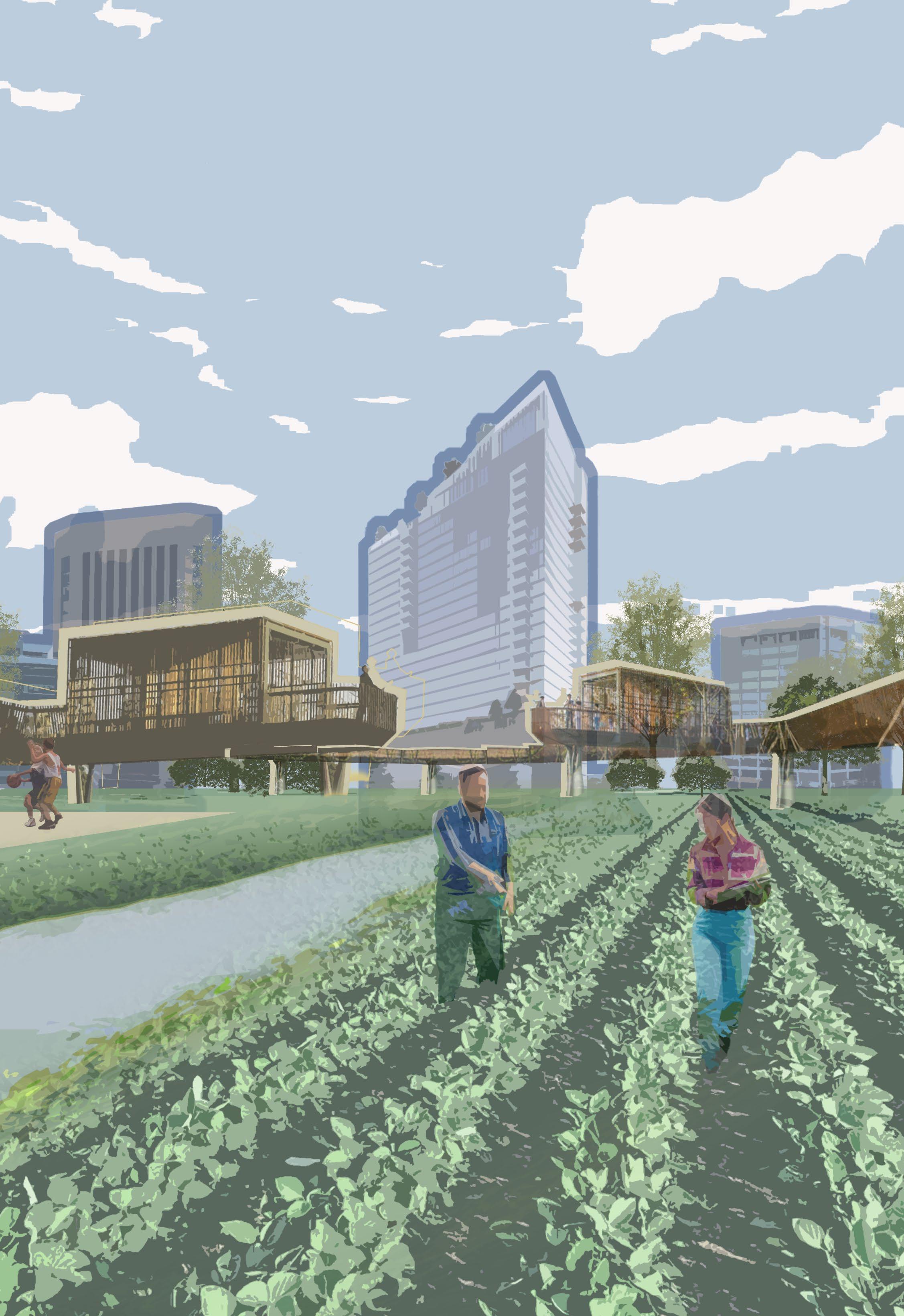 Farming Area in middle of the site so that work area is neafor the residents and takes less transport time to the shopping centre.
