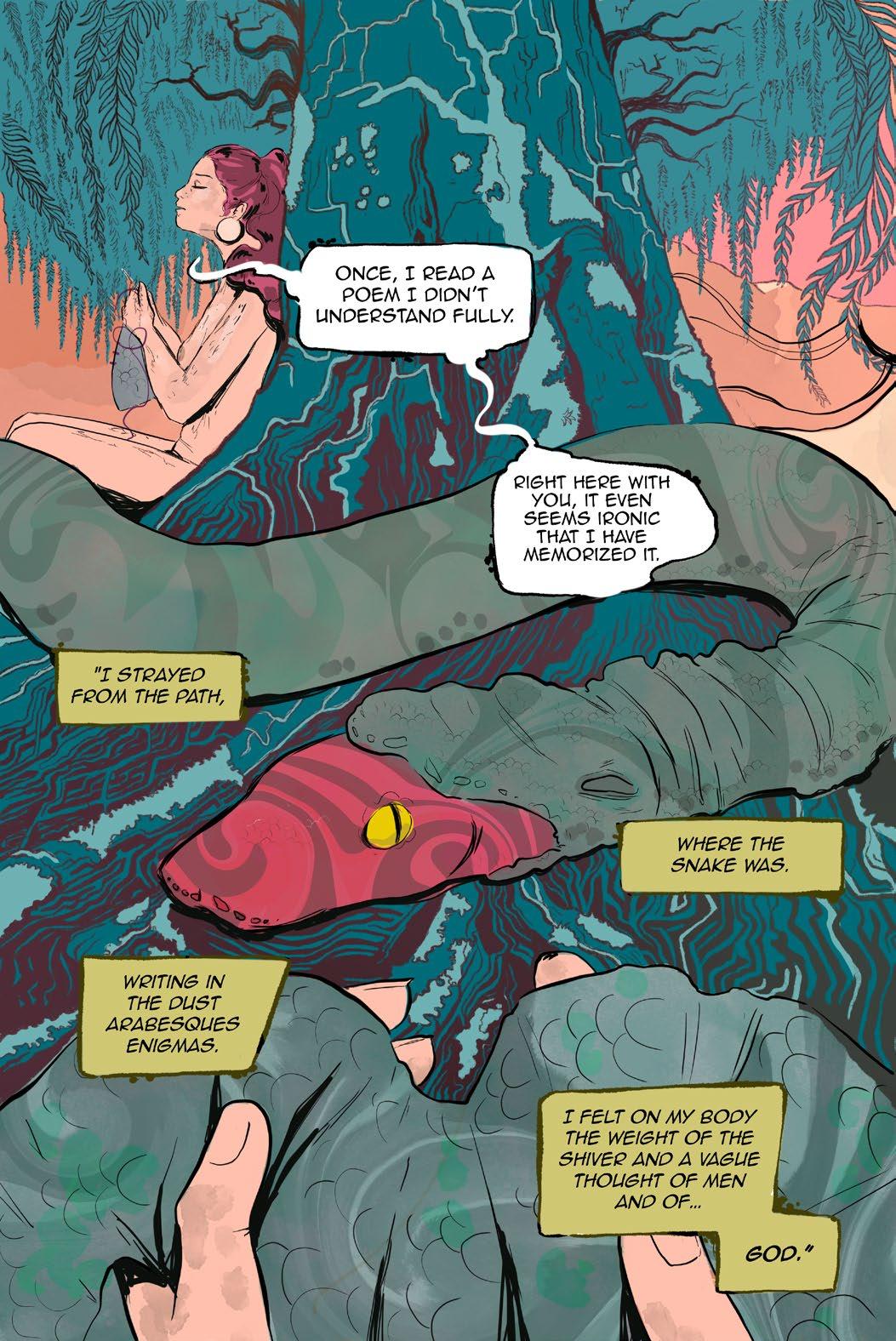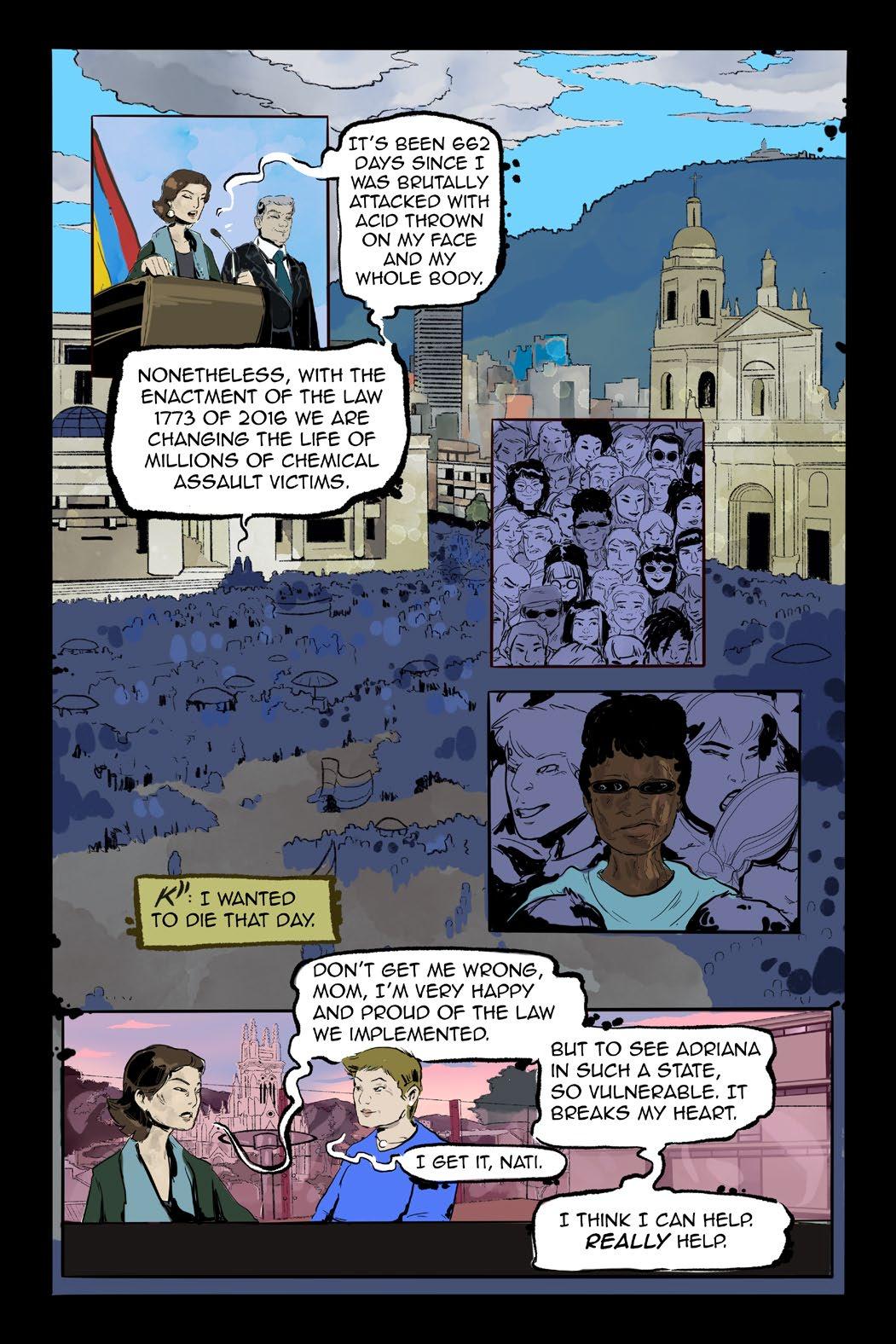 “KAIA: awakening in the deep” is the mystical embodiment of Natalia Ponce de León – a survivor of a brutal acid attack – she turned the tragedy into a national movement to tackle gender-based violence and change perceptions of women in Colombia. After the attack, Natalia plunges into the abyss of constant pain and depression that takes her on a journey to a spiritual kingdom inhabited by a giant snake with the power to heal or destroy. She returns from the netherworlds as Kaia to defend the vulnerable and protect the innocent who are traumatized by injustice and violence in modern Colombia. Natalia’s story is imagined in a fantastical augmented reality comic book created by Melanconnie, Laura Velandia and Faebian Ceruleo.