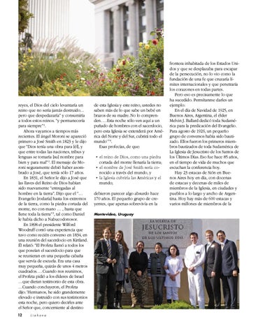 de esta Iglesia y este reino, ustedes no saben más de lo que sabe un bebé en brazos de su madre. No lo comprenden. …Esta noche sólo ven aquí a un puñado de hombres con el sacerdocio, pero esta Iglesia se extenderá por América del Norte y del Sur, cubrirá todo el mundo’” 4. Esas profecías, de que: • el reino de Dios, como una piedra cortada del monte llenaría la tierra; • el nombre de José Smith sería conocido a través del mundo, y • la Iglesia cubriría las Américas y el mundo; debieron parecer algo absurdo hace 170 años. El pequeño grupo de creyentes, que apenas sobrevivía en la Montevideo, Uruguay