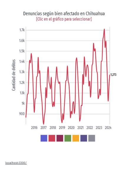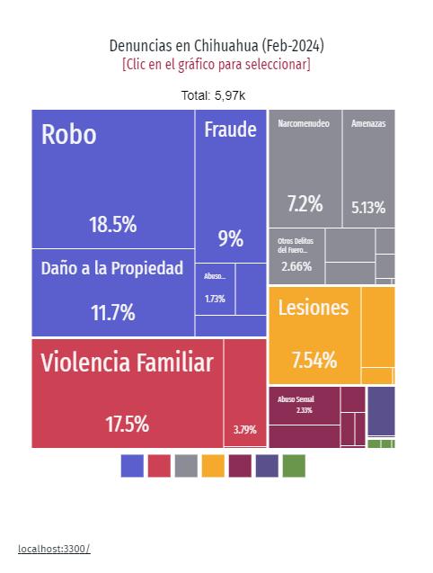 Esta gráfica nos muestra los delitos más reportados en Chihuahua, se puede observar que aunque la violencia familiar no es la más alta, es la segunda y tiene números altos, 1273 delitos de este tipo.