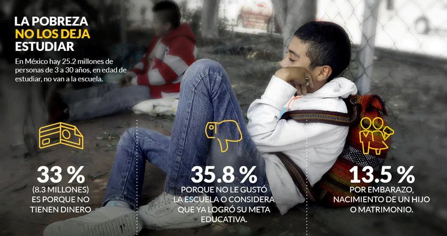 Deserción escolar: Aunque no todos los casos de deserción escolar están directamente relacionados con la pobreza, existe una correlación significativa entre los niveles de pobreza y la probabilidad de abandonar la escuela Según datos del Instituto Nacional de Estadística y Geografía (INEGI), en 2019, la tasa de deserción escolar en México fue del 4 5%