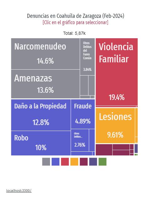 7 Se observ un 19 4% de los casos que se presentan en Coahuila. Este porcentaje es alto para lo que supone el lugar de Coahuila en seguridad Ya que se tienen 1163 denuncias de este tipo hasta el mes de Febrero de 2024.