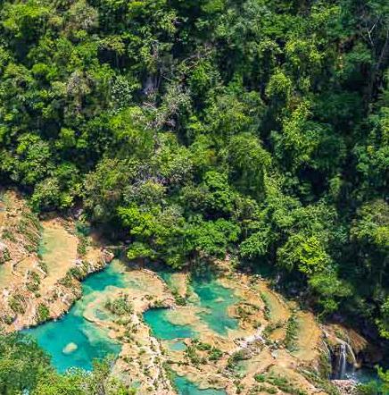 metros de altura que permite observar las pozas naturales de Semuc Champey (cuyo nombre significa “donde el río se esconde bajo las piedras”), creadas a partir de antiguas formaciones de bicarbonato de calcio.