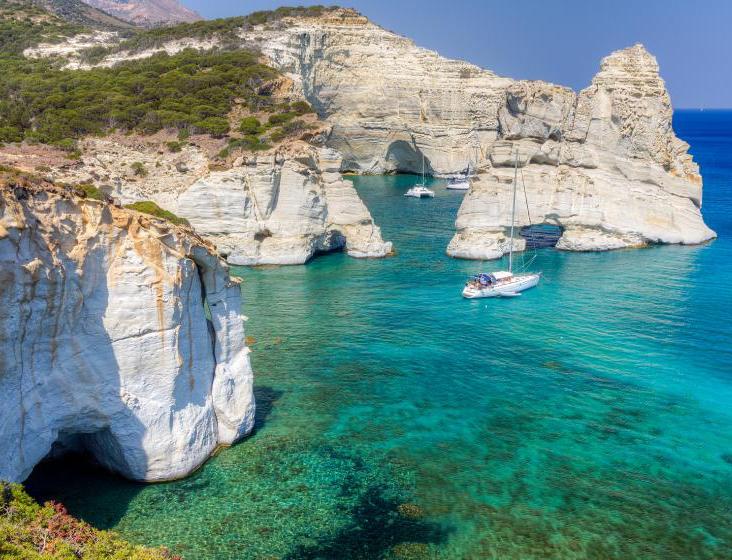 El famoso y fascinante archipiélago de las Cícladas está constituído por un grupo de islas de varias dimensiones esparcidas por las azules aguas del Mar Egeo al sudeste de Atenas. Algunas de estas islas son muy conocidas, como Santorini y Mykonos, mientras otras permanecen en el anonimato, menos turísticas, pero poseen igualmente una belleza imponente, como Milos. El nombre de este conjunto de islas deriva de la palabra griega cyclos, que significa círculo, y tiende a identificar la posición de las islas alrededor de la isla de Delos, la isla sagrada de Apolo. Las Cícladas han sido el lugar de nacimiento de una de las más importantes civilizaciones del Mediterráneo y son muchos los que sostienen que estas tierras hayan acogido la misteriosa ciudad de Atlántida. La belleza de estas islas no tiene parangón, las ciudades, rodeadas por las azules aguas del Mar Egeo y calentadas por un sol límpido, se caracterizan por la arquitectura tradicional dominada por el color blanco de las casas, con ventanas y puertas azules, por las callejuelas estrechas, por las pequeñas y numerosísimas capillas con el techo en forma de cúpula y por sus famosos molinos de viento.