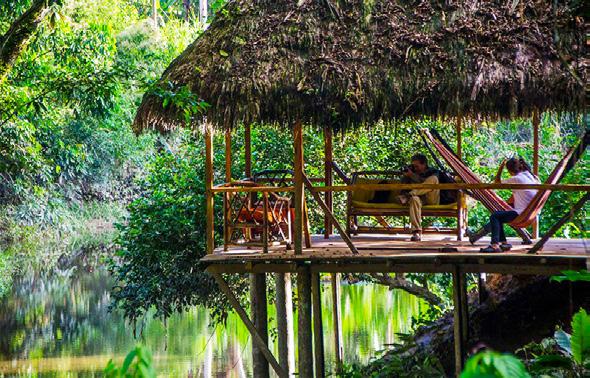 Mientras nos desplazamos por el agua, disfrutamos de la frescura de la atmósfera, la belleza de los paisajes y los sonidos y las vistas únicos de la selva tropical. El lodge, que sólo tiene acceso por el río, lleva funcionando más de 24 años, siendo pionero en la sostenibilidad