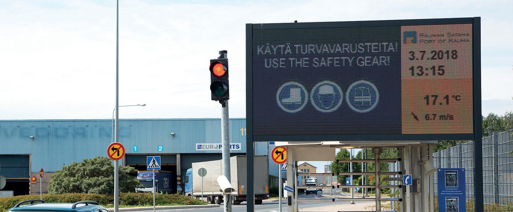 THE SPEED LIMIT in the harbour area is 40 km/h on Hakunintie, 30 km/h on quay areas and 20 km/h at the container terminal. Regular traffic rules and signs apply in the harbour area. Violation of speed limits and other traffic regulations will result in temporary or permanent cancellation of the access permit. Parking at the quay is only permitted at the designated parking spots. Only short-term parking for official business (less than 30 min) is allowed at the quay provided that the vehicle is equipped with yellow or blue strobe light and the vehicle is parked out