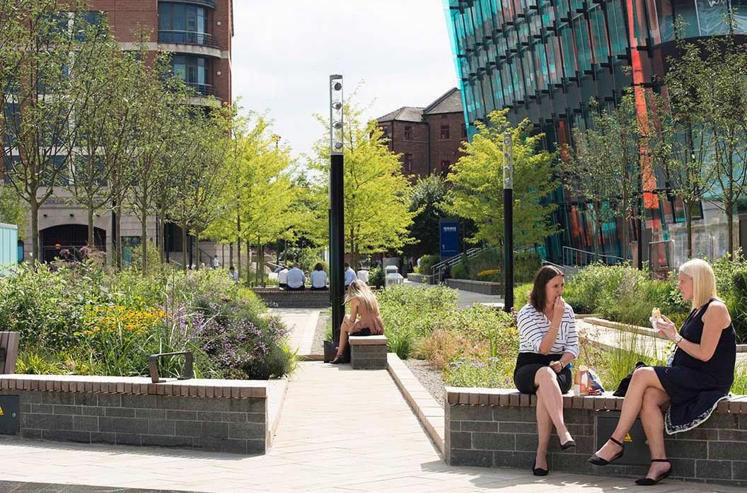 Attraktive öffentliche Räume laden die Menschen zum Verweilen ein. Eine qualitative Gestaltung und hochwertiges Stadtmobiliar schaffen Aufenthaltsqualitäten in den Freiräumen der Stadt. Über die Gestaltung hinaus kann durch gezielte Maßnahmen auch das lokale Mikroklima verbessert werden und einen Beitrag zum Stadtklima leisten. Die Schatten von Bäumen und die Minimierung von versiegelten Flächen reduzieren die Überhitzung und machen die Wege und Plätze auch im Sommer nutzbar. Durch den Einsatz von Bepflanzungen können sogar positive Effekte für die Gesundheit entstehen. Grün in der Stadt trägt zur Stressreduktion bei und reduziert die Luftverschmutzung in Städten.