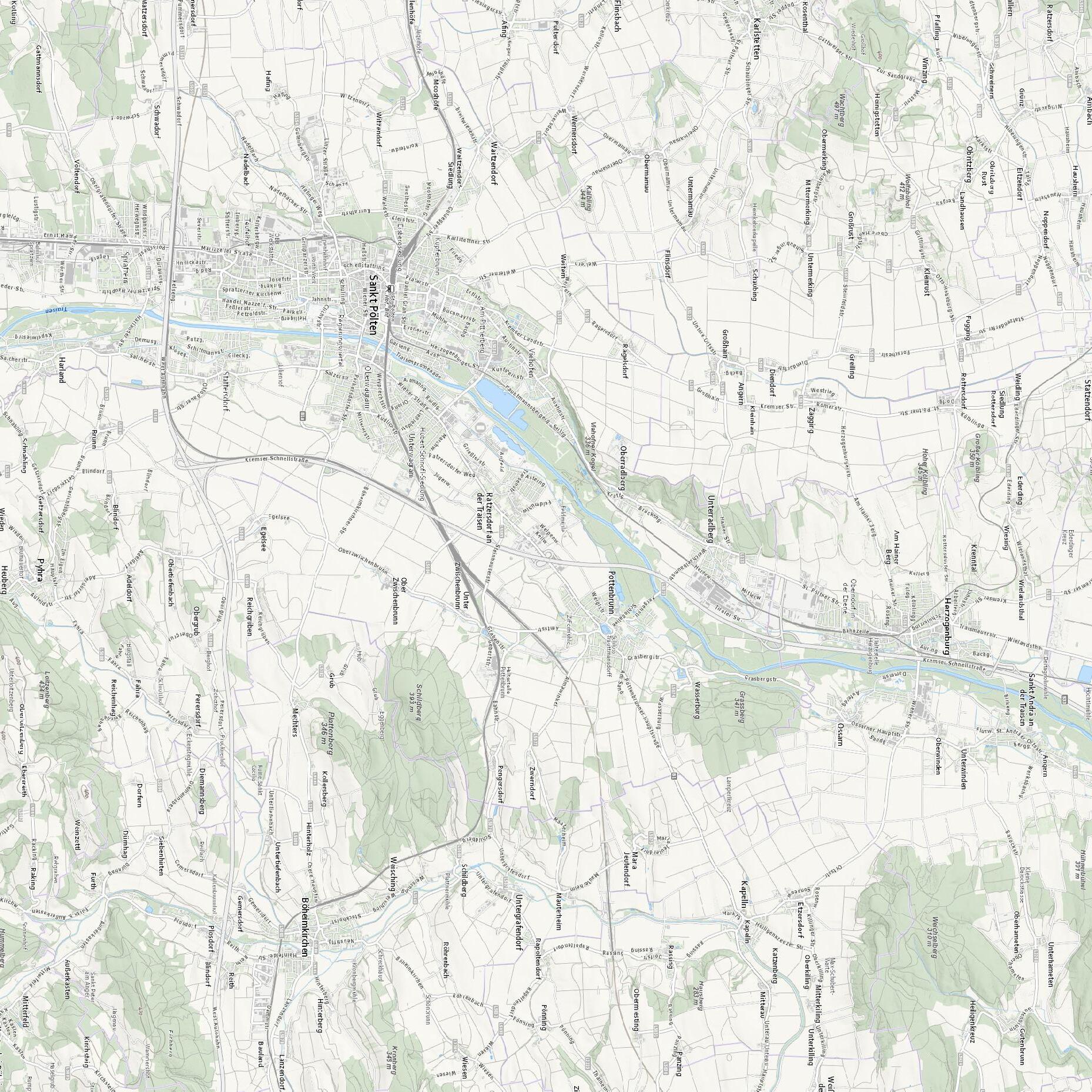 Darüber hinaus ist die Siedlungsstruktur von St. Pölten stark von der Traisen geprägt, die das Stadtgebiet von Süden nach Norden quert und dabei das Zentrum von St. Pölten unmittelbar an seiner Ostseite berührt.