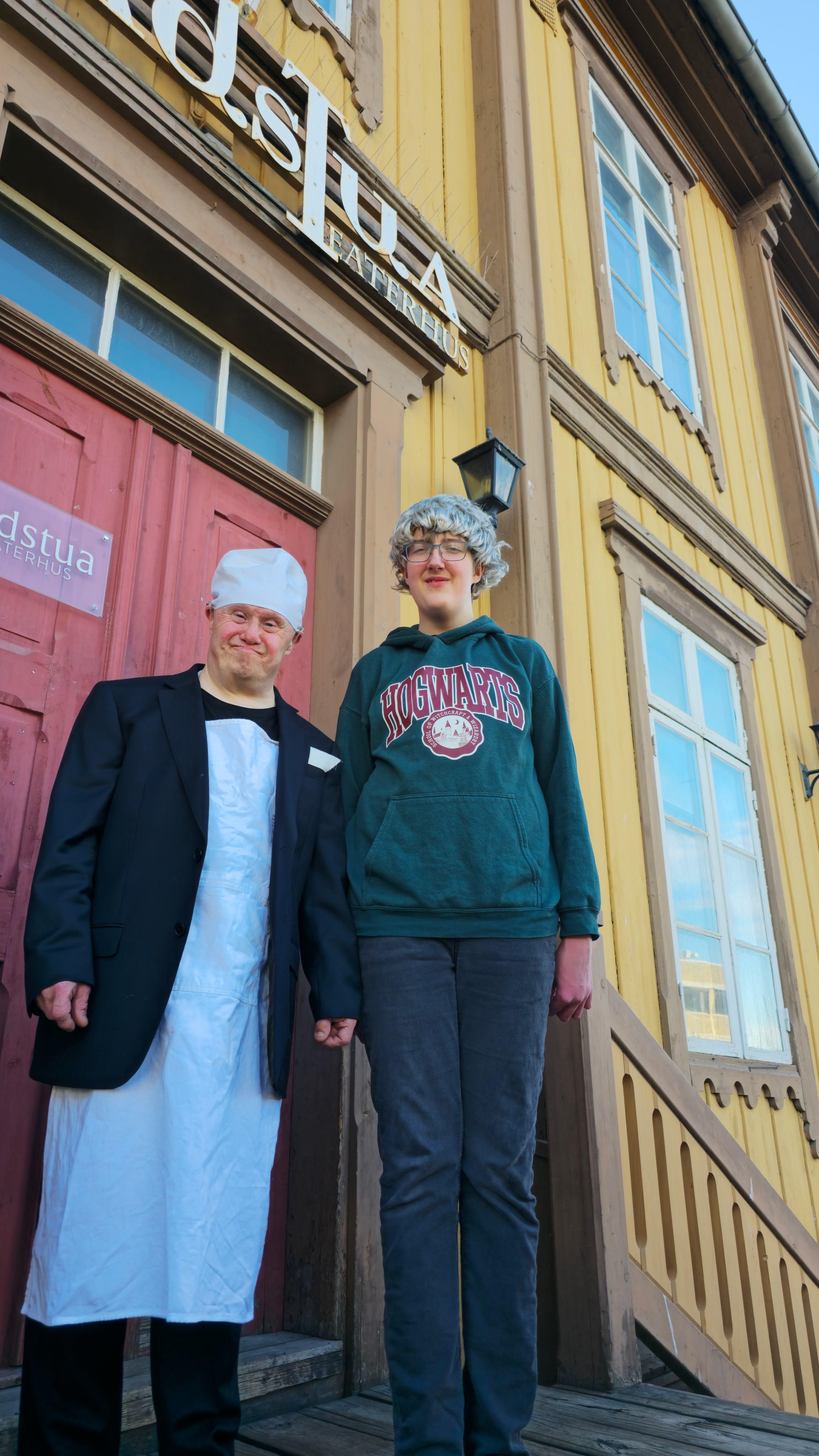 Jesper som sitter i rullestolen syntes det var veldig flott at inngangen hadde både en liten rampe og at døren hadde trykknapp for automatisk åpning. Dette var veldig rullestolvennlig.
