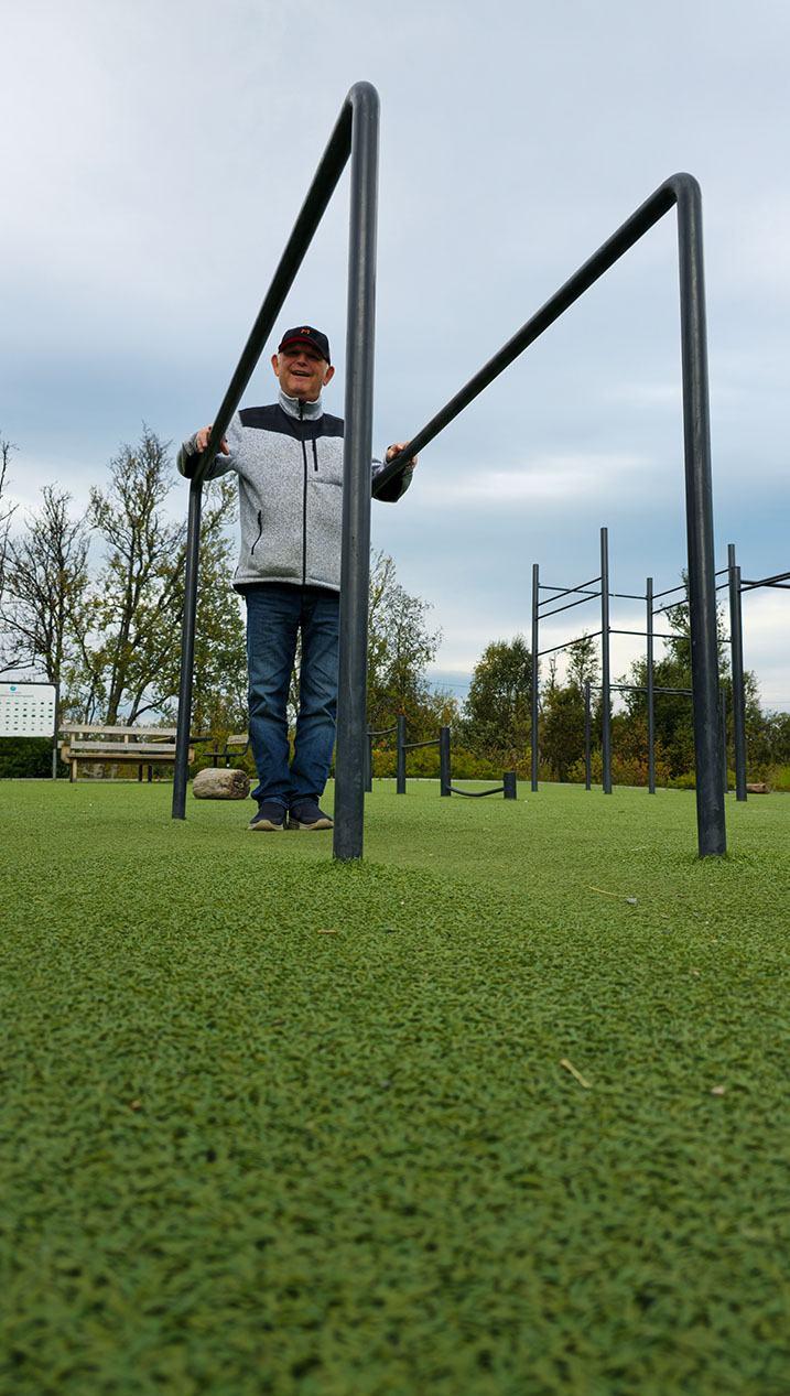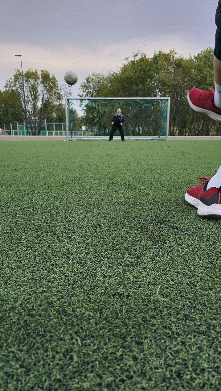 På bildet ser vi Ståle (40 år) med sine nyinnkjøpte røde sneakers vise frem hvordan man curler ballen rett i krysset.