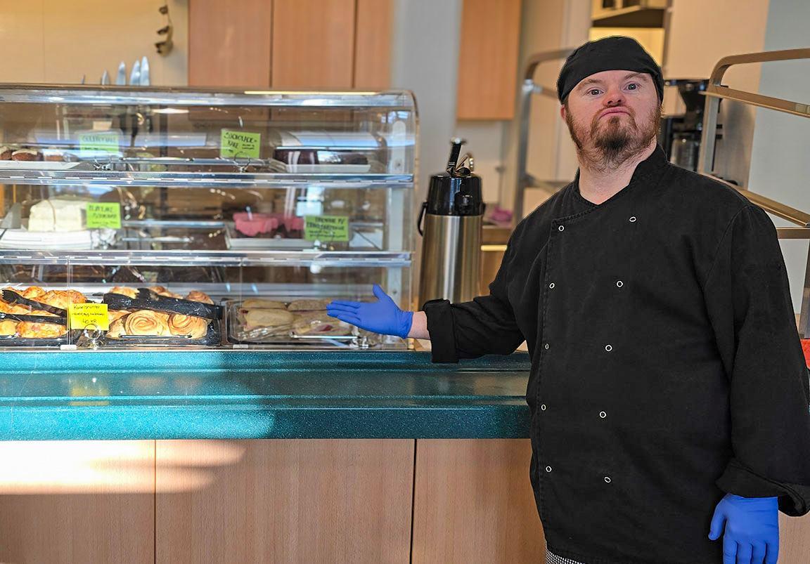 Marius viser frem de mange gode kakene som selges på kafeen.