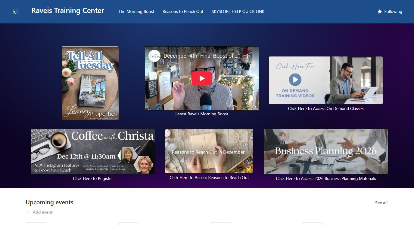 The Morning Boost is the launchpad for Business Planning, Marketing and Motivation Monday through Thursday! Delivered to your Raveis.com email each morning, it contains a daily broadcast that can keep you current with company events, reasons to reach out to your client base and fresh marketing ideas to implement that will make a BIG impact to your bottom line. The Boost can be a very impactful way to start to build familiarity with not only our systems, but our culture.