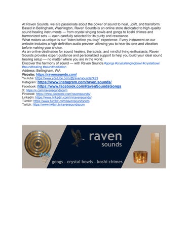 At Raven Sounds, we are passionate about the power of sound to heal, uplift, and transform. Based in Bellingham, Washington, Raven Sounds is an online store dedicated to high-quality sound healing instruments — from crystal singing bowls and gongs to koshi chimes and harmonized sets — each carefully selected for its purity and resonance. What makes us unique is our “listen before you buy” experience. Every instrument on our website includes a high-definition audio preview, allowing you to hear its tone and vibration before making your choice. As an online destination for sound healers, therapists, and mindful living enthusiasts, Raven Sounds provides expert guidance and personalized support to help you build your ideal sound healing setup — no matter where you are in the world. Discover the harmony of sound — with Raven Sounds. Address: Bellingham, WA#gongs #crystalsingingbowl #crystalbowl #soundhealing #soundmediation