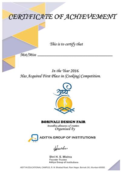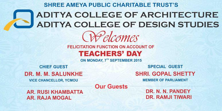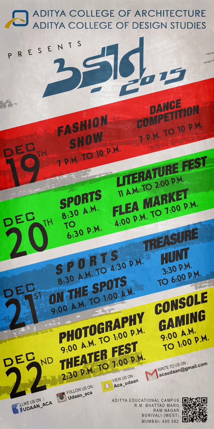 2 7TH DECEMBER 2016 (SATURDAY) 10:00 AM – 12:00PM SENIOR CITIZEN SESSION AN OLDIE BUT A GOLDIE 2:00PM – 4:00PM 1. CLAY WORKSHOP ARTIST: DEEPALI PARAB 2. ABSTRACT PAINTING ON CANVAS ARTIST: KALYANI AMRUTE 3. GEOMETRIC PATTERN 2D TO 3D ARTIST: AMEY MHATRE 4:30 PM – 6:30 PM INTER-COLLEGE FASHION SHOW –EXPRESS YOURSELF IN STYLE 7:00 PM – 10:00 PM CULTURAL EVENT WITH CELEBRITY PRESENCE DAY 3 8TH DECEMBER 2016 (SUNDAY) 10:00 AM – 12:00 PM DRAWING COMPETITION FOR CHILDREN BETWEEN THE AGE OF 6-16 ALL YOU NEED IS A THOUGHT AND PAINT COOKING COMPETITION FOR WOMEN –BRING OUT THE MASTER CHEF IN YOu. 2:00 PM – 4:00 PM 1.THE GEOMETRY OF: GOND PAINTINGS MADHUBANI PAINTINGS ARTIST: SADASHIV KULKARNI 2. CREATIVE WORKSHOP – A) TERRACOTTA B) METAL WIRE ARTIST: KALYANI AMRUTE 3. MAGIC OF MUSIC AND PATTERNS ARTIST: AMEY MHATRE MOHAN CHAUGHULE 4:30 PM – 6:00 PM FANCY DRESS COMPETITION FOR CHILDREN BELOW 10 LET’S GO FANCY 6:00 PM – 7:00 PM BORIVALI’S GOT TALENT FINALE 7:00PM – 7:15PM CLASSICAL PERFORMANCE 7:15 PM – 10:00PM VALEDICTORY register now FOR FURTHER DETAILS CONTACT: +91-22-61106135 +91 98333 00496 EVENT CO-ORDINATOR: AR. TRIPTI BISWAS +91 99308 70005 LAST DATE OF REGISTRATIONS: 9TH DECEMBER DATES OF AUDITIONS: 9TH, 10TH, 11TH DECEMBER VENUE: AUDITORIUM, ADITYA COLLEGE OF ARCHITECTURE ACA aditya group of institution b orivali(west) mumbai- 92 aditya college of architecture shree ameya charitable trust’s w orkshops c ompetitions DAY 1 16TH DECEMBER 2016 (FRIDAY) 10:00 AM – 12:00 PM INAUGuRAL FUNCTION OF ARGHYA 2:00 PM – 4:00 PM 1 TRIBAL WARLI ARt ARTIST: ALKA JOSHI 2. CALLIGRAPHY WORKSHOP ARTIST: ASHUTOSH 3. TIE AND DYE WORKSHOP ARTIST: GARODIA STUDENTS 4:30 PM – 6:30 PM INTER-COLLEGE MUSIC COMPETITION BATTLE OF BANDS 7:00 PM – 7:40 PM OPENING PERFORMANCE BY STUDENTS OF ADITYA COLLEGE OF INSTITUTE AND CLASSICAL PERFORMANCE 7:40 PM – 9:15 PM CULTURAL EVENT WITH CELEBRITY PRESENCE 9:15 PM – 10:00 PM PERFORMANCE BY A FUSION MUSICAL GROUP